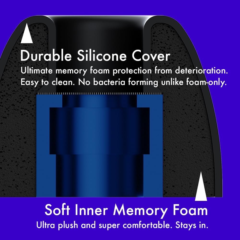 [Silicone Cover] Flexible protective layer over the memory foam. BLOCKS wax, dirt, oil, microhairs from the memory foam. Less replacements than memory foam only ear tips. Enhances protection and durability.