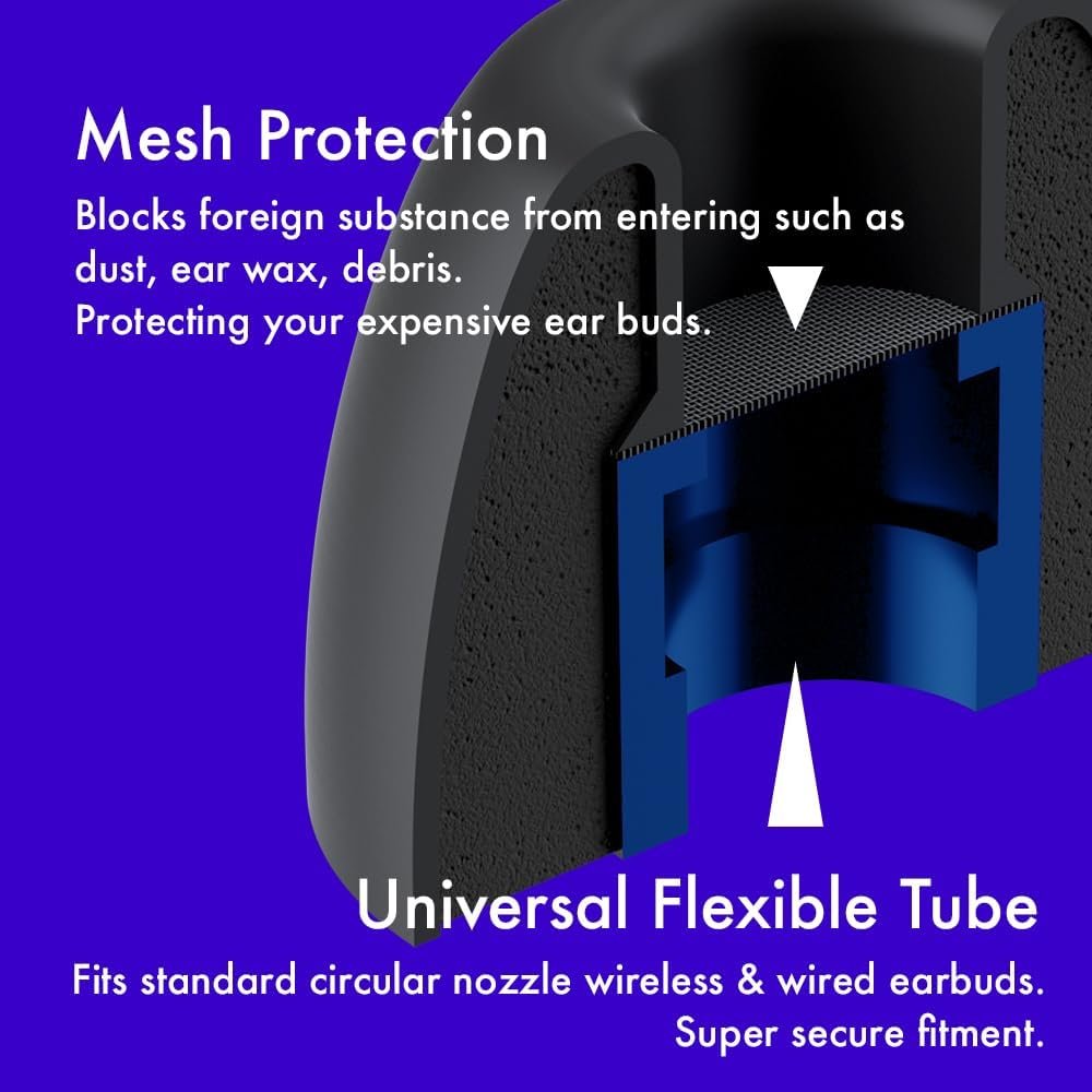 [First Defense Mesh] Protects from wax, oil, microhairs, dirt from entering your expensive ear buds. [Memory Foam] Fits perfectly and comfortably to your inner ear. Alleviates any pain from silicone-only tips.