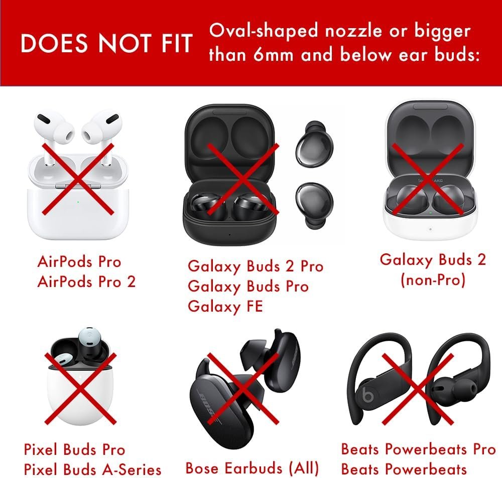 NOT for AirPods Pro 1/2, Galaxy Buds3 Pro, Galaxy Buds2 Pro, Galaxy Buds Pro, Galaxy Buds 2 (non-Pro), Pixel Buds Pro, All Bose earbuds, Beats Powerbeats.