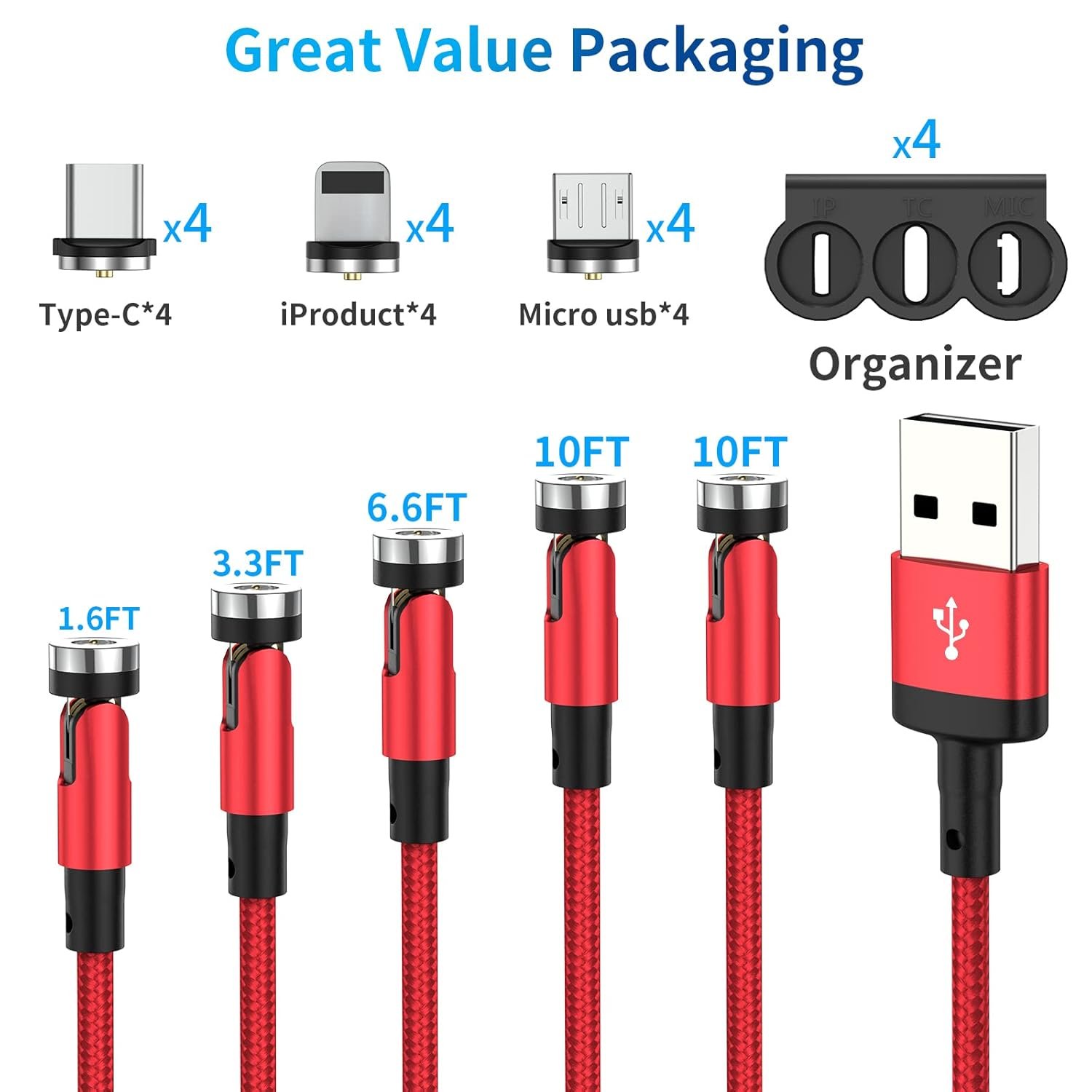 ⚡SUPER VALUE PACK – 5 Pack of red magnetic usb charging cable in 4 lengths, package includes. 2*10FT magnetic charging cable, 1*6.6FT magnetic charging cable, 1*3.3FT magnetic charger cable, 1*1.6FT magnetic charging cable, 4*magnetic micro usb tips, 4*magnetic Type-C tips, 4*magnetic i-product tips, you can charge all your devices.【If you need extra magnetic tips, search Amazon for B0B81FR5DX.】