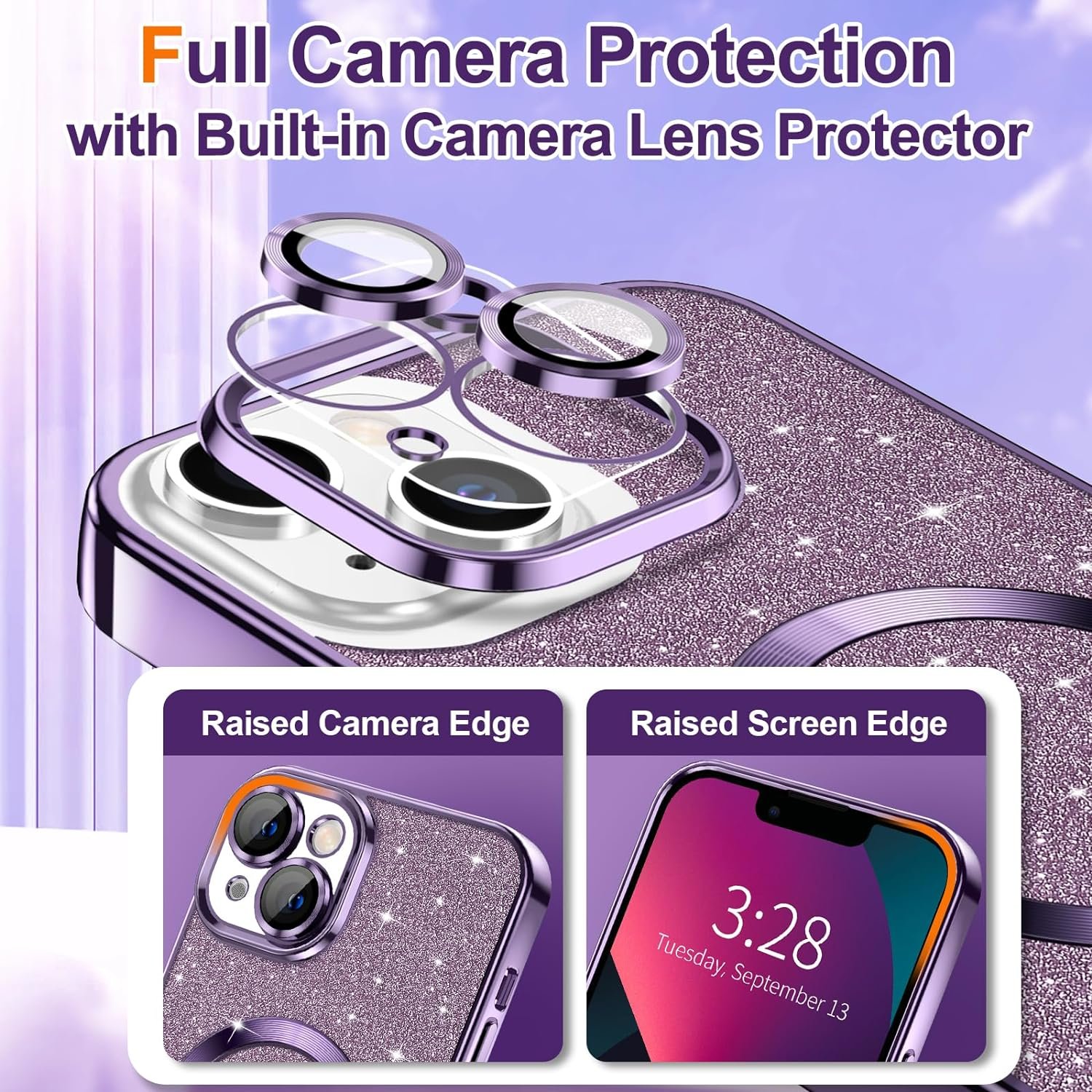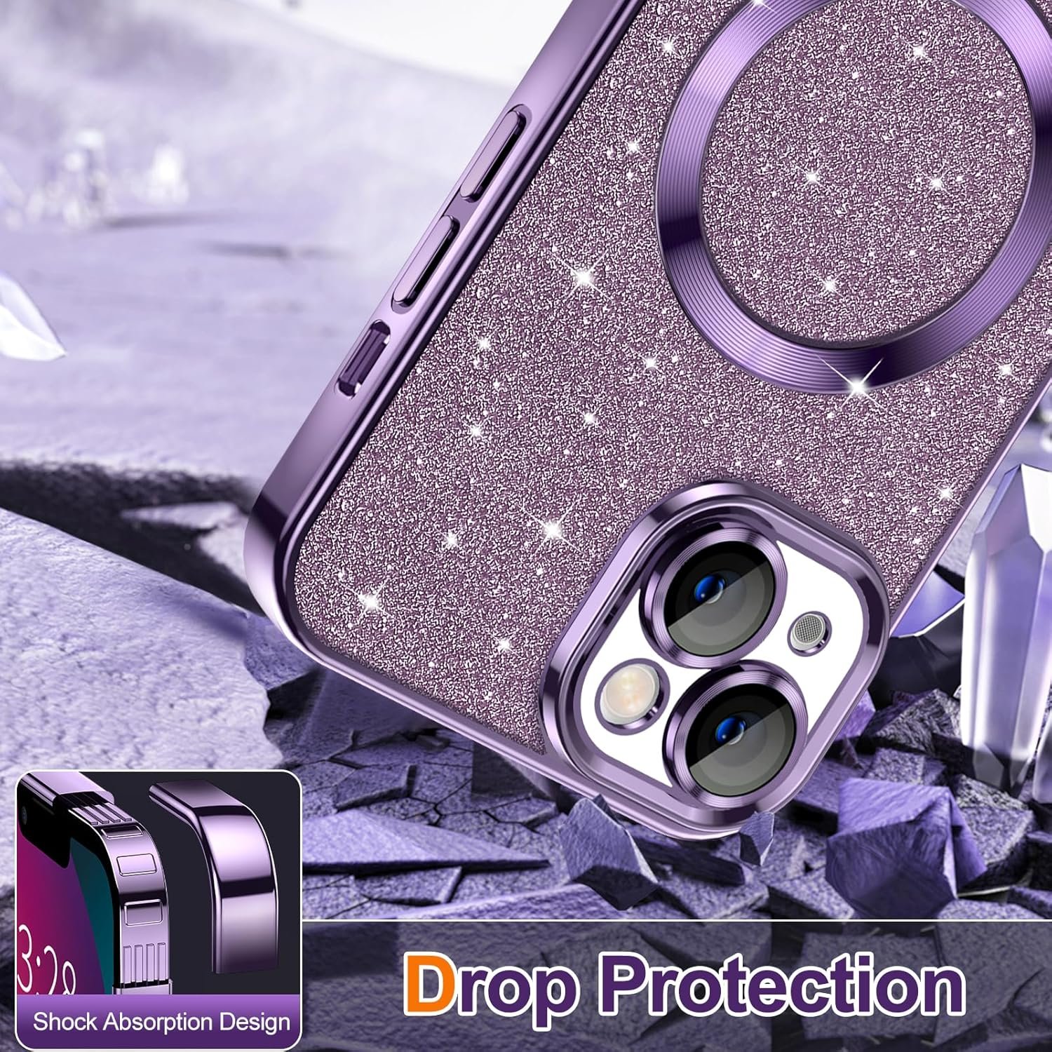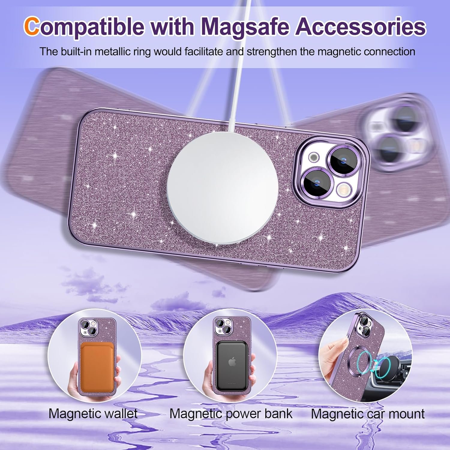 Hython for iPhone 13 Case Glitter, Clear Magnetic Phone Cases with Camera Lens Protector [Compatible with MagSafe] Bling Sparkle Plating Soft TPU Shockproof Protective Cover for Women Girls, Purple