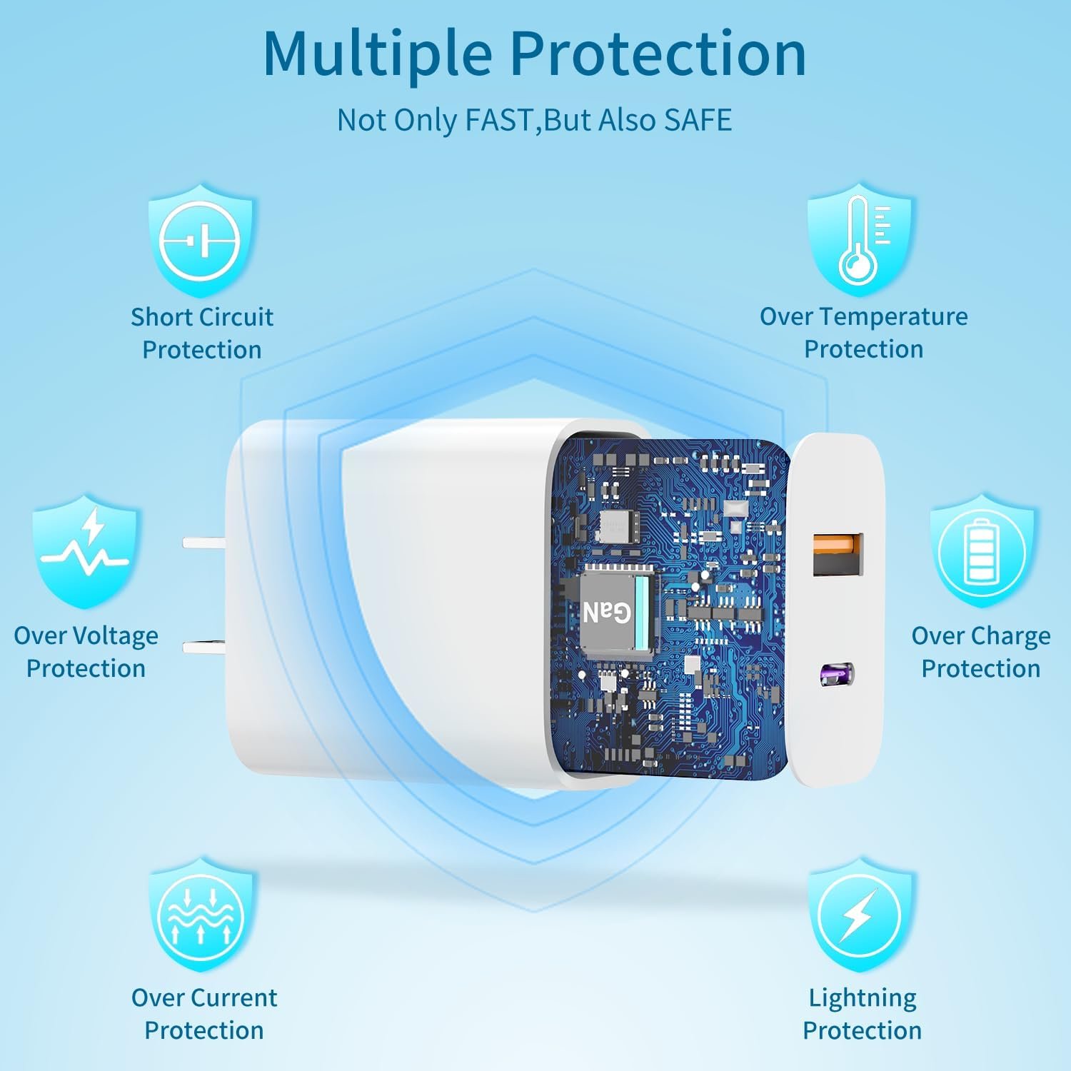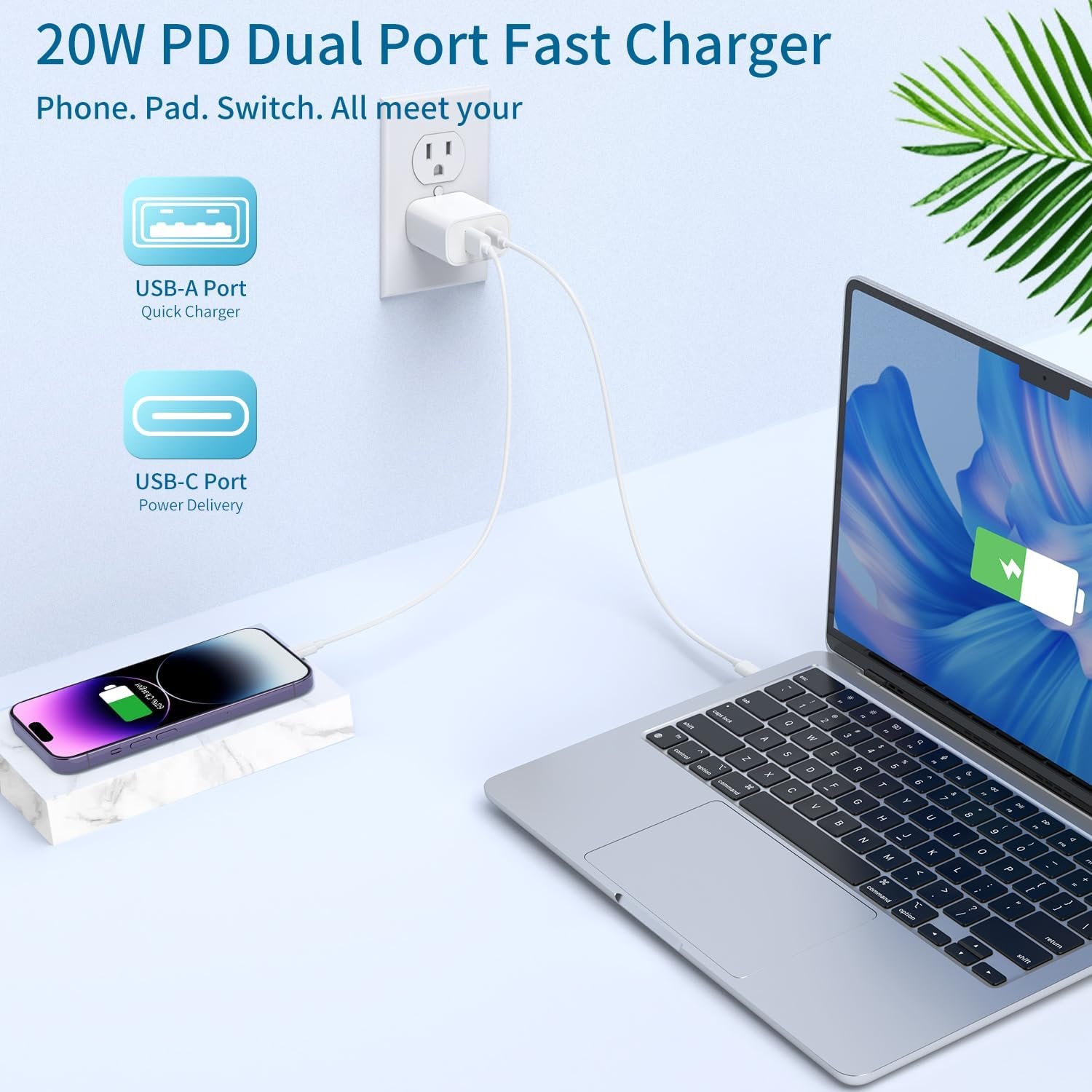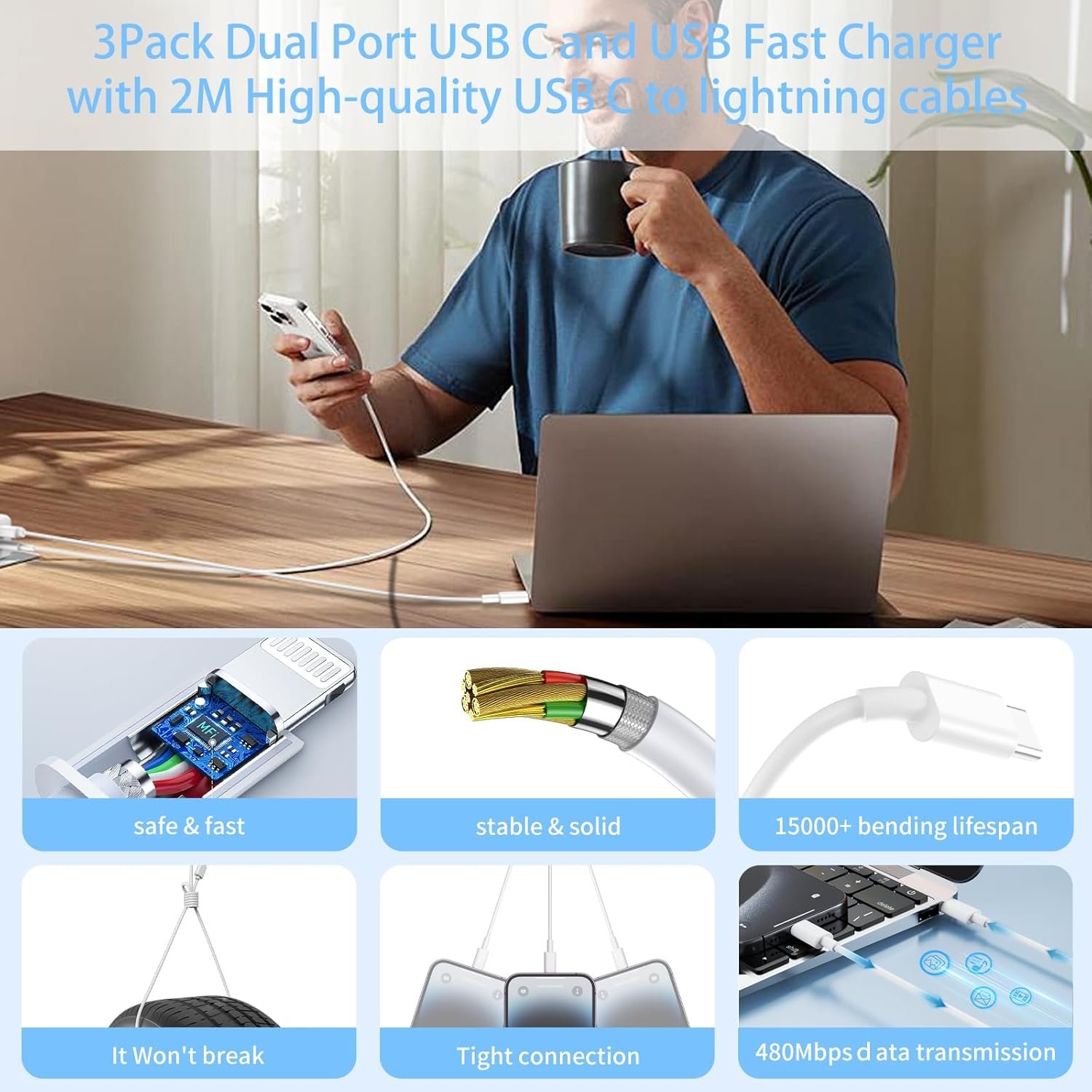 [Universal Compatibility] Our USB C and USB Dual port fast charger plug compatible with All Smartphones,Tablets etc. Supports fast charge for iPhone 15/14/13/12/11/Pro/Max/Plus/XR/XS/X/8/7, iPad Air/iPad Pro/iPad Mini, Samsung Galaxy and more. (Comes with USB C to l.ightning fast charging cable, does not include USB A to l.ightning/USB C cable and USB C to USB C cable.)