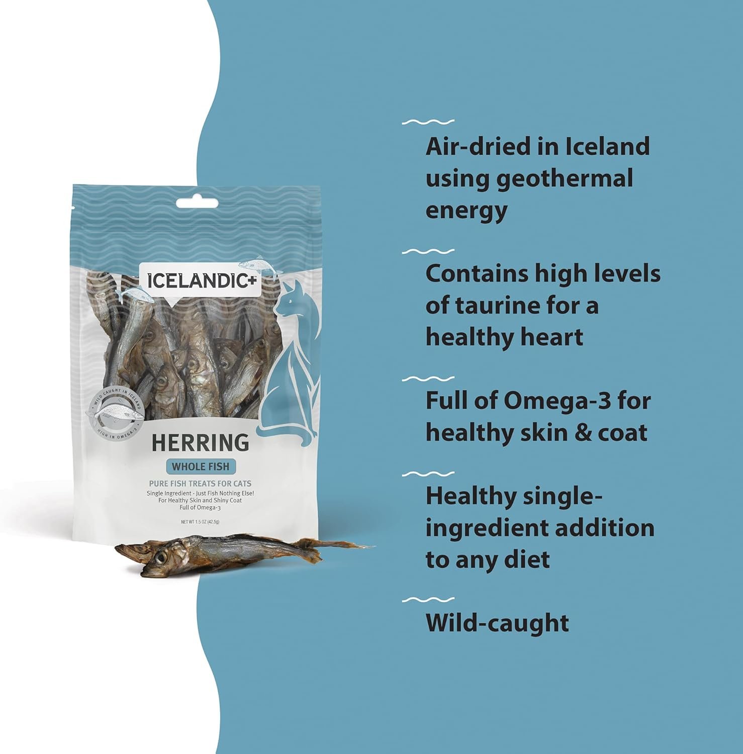 Your cat will love the irresistible taste and satisfying crunch of our nutritious and natural Herring Whole Fish cat treats, made from one single ingredient—whole Herring. They are wild-caught in the North Atlantic Ocean, and air-dried within USDA, EU, and MAST standards. Our 100% edible and digestible Herring treats promote healthy skin and coat with Omega-3 fatty acids – plus they are loaded with Taurine. They also reduce plaque and tartar build-up, making them good for your cat’s teeth. Plus, since these cat fish treats feature a single protein source, they’re a smart choice for cats with food sensitivities. Your cat will love the irresistible taste and satisfying crunch of our nutritious and natural Herring Whole Fish cat treats.