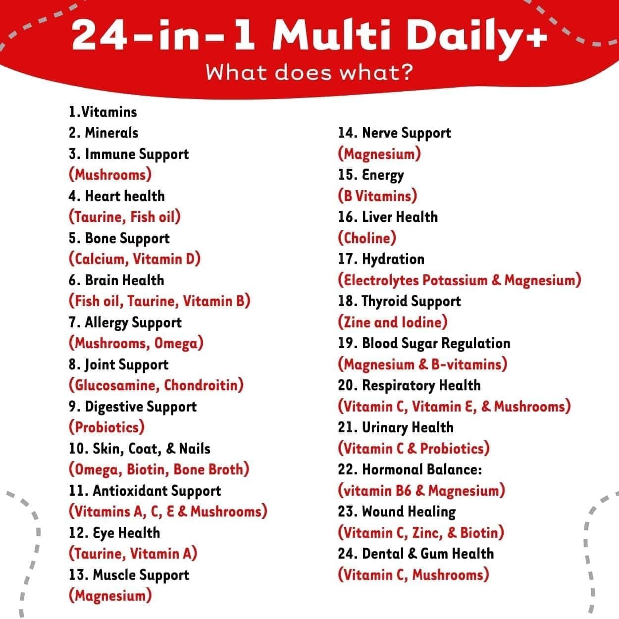 Comprehensive Vitamin & Mineral Formula: Includes key vitamins (A, B-complex, C, D3, E) and minerals like calcium, magnesium, and zinc to address the specific needs of senior dogs, promoting energy, heart health, and cognitive function.