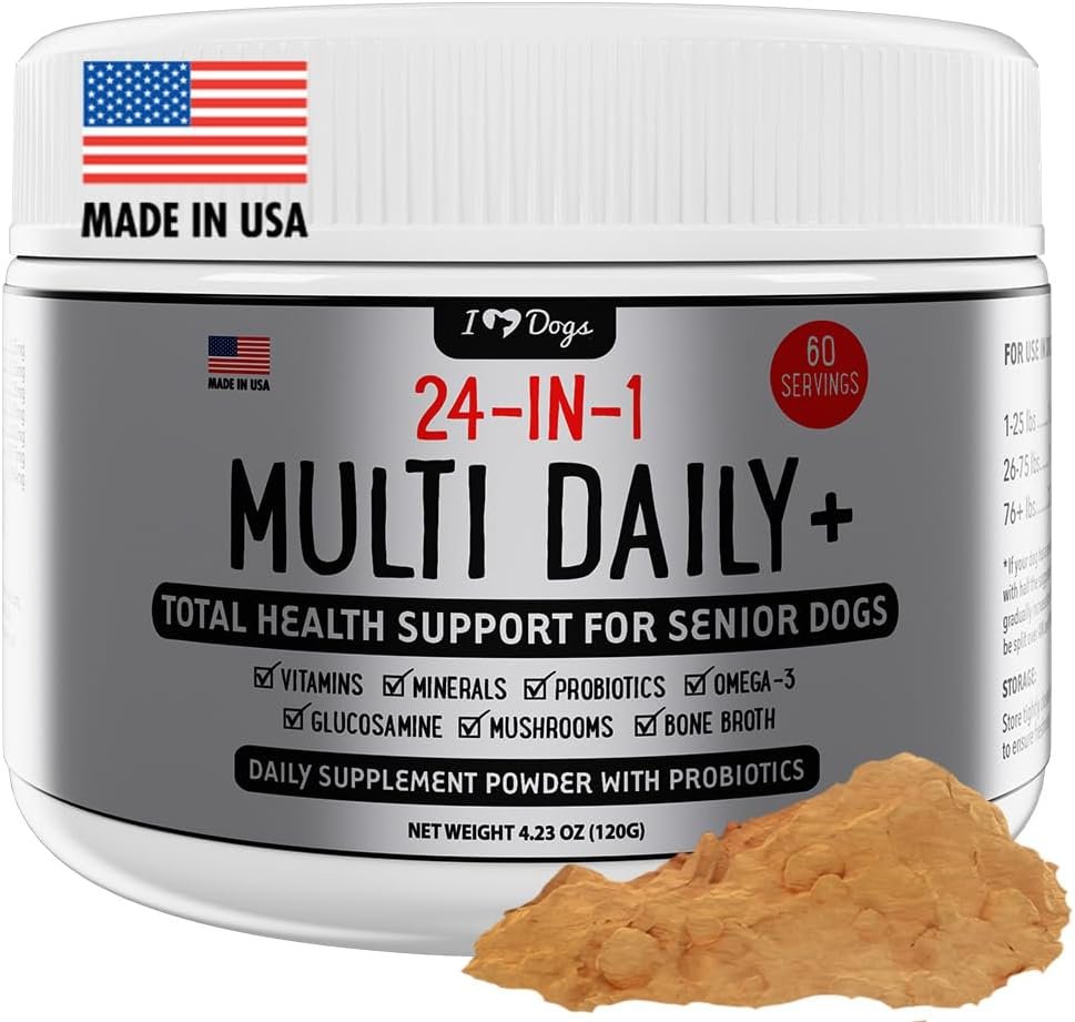 iHeartDogs 24-in-1 Senior Multivitamin Daily+ Total Health Support Powder with Probiotics, Omega-3, Glucosamine, Mushrooms & Bone Broth- 60 Servings