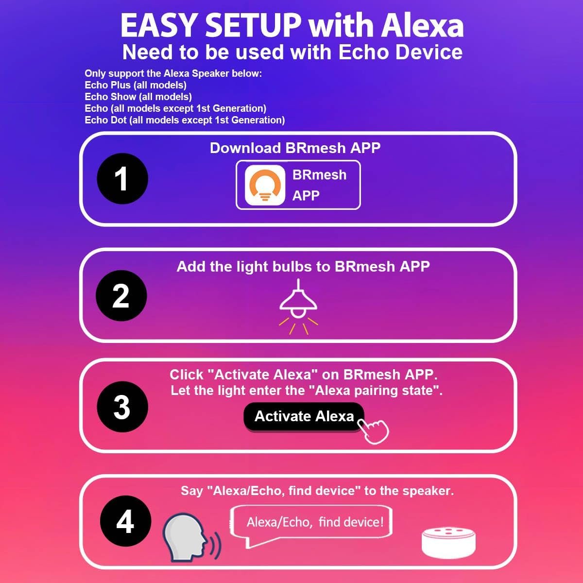 Alexa Voice Control: Alexa Voice Control must be used with Echo devices. Simply say “Alexa/Echo, find device” to use voice commands to connect the light bulb to the network. In fact, when an Echo device is connected to more than 4 lights, it may become unstable. To address this issue, we have developed the Virtual HUB feature, which can support up to 100 lights stably for each Virtual HUB.