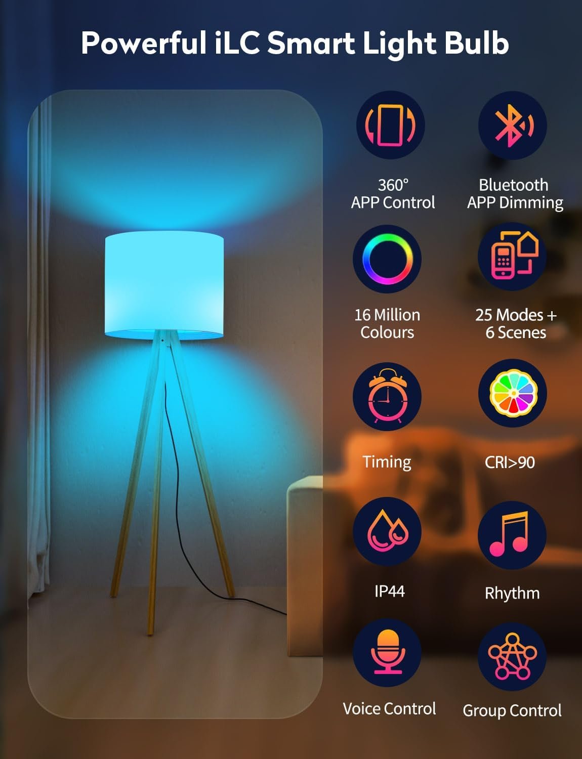 Practical Alexa Light Bulb(Need Echo device): This is the latest upgrade to the iLC LED Bluetooth Color changing Alexa Light Bulb, which delivers 1300 lumens of luminous flux at only 13 watts, 130 Watt Equivalent. Feature-rich, works with alexa, BRmesh App control, 16 million colors, 25 mood modes, every mood will find the right mode to express itself at night.