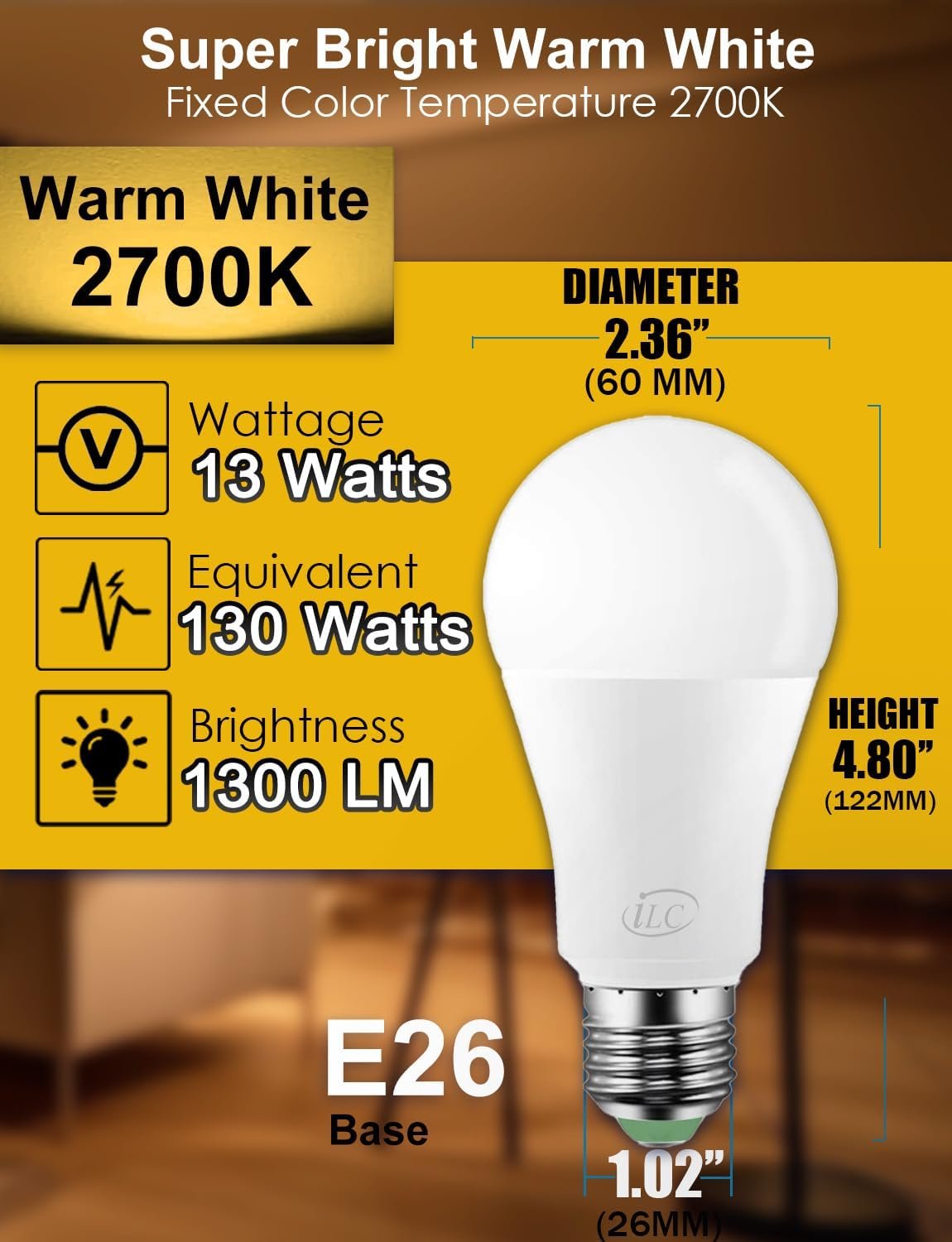 130W equivalent brightness upgrade: Ultra-high brightness! Ultra-long life! Super Brightness 2700K Warm White Everyday Lighting, 1300 lumens, equivalent to 130W, with a color rendering index of up to 90Ra, no video flash, truly brings out the natural colors of life. It utilizes 24 beads 1W high brightness LED chips; lower current to increase lumens per watt; lower temperature of each chip while reducing light decay to extend the life of the LED bulb.