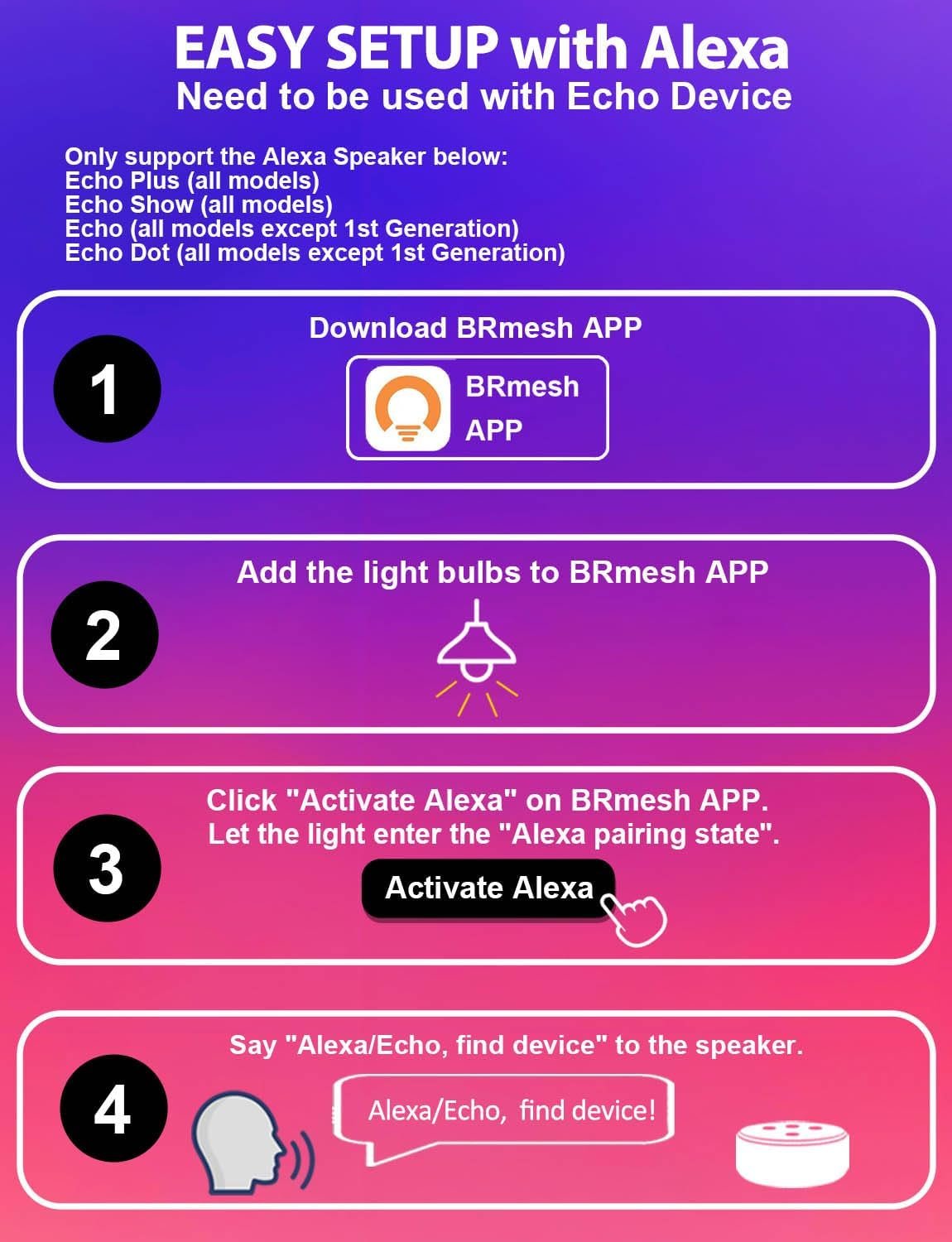 How to pair with Alexa/Echo: 1. Download BRmesh APP; 2. Use BRmesh APP to add lights; 3. Click “Activate Alexa” on BRmesh APP; 4. Say “Alexa/ Echo, find device” to the speaker; 5. Then you can use Alexa to control the light.