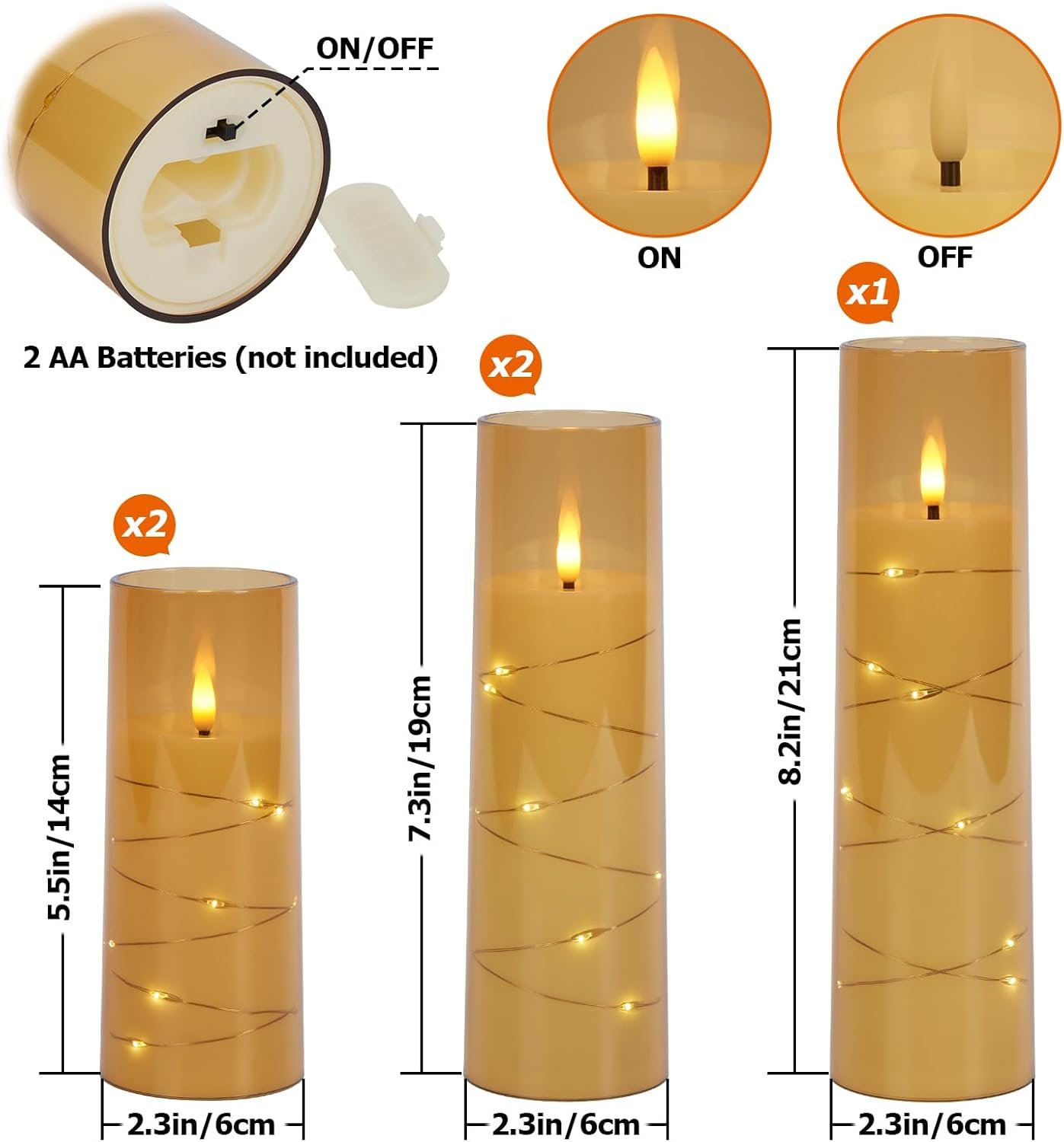 Each set includes 5 flameless pillar candles with a diameter of 2.3 inches and varying heights (5.5″, 5.5″, 7.3″, 7.3″, and 8.2″), featuring robust acrylic shell and LED core.