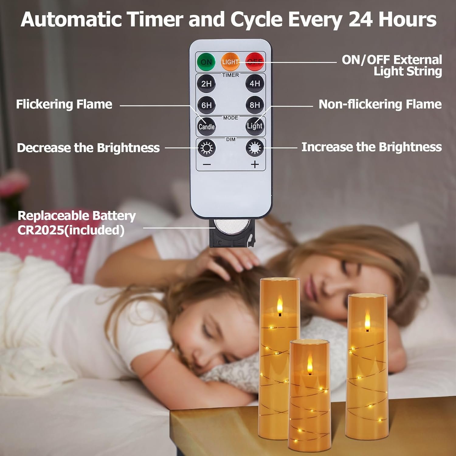 Our flameless candles feature an upgraded 11-key remote control (CR2025 battery included) for easy operation. The embedded light strings can be individually controlled using the “LIGHT” button on the remote.
