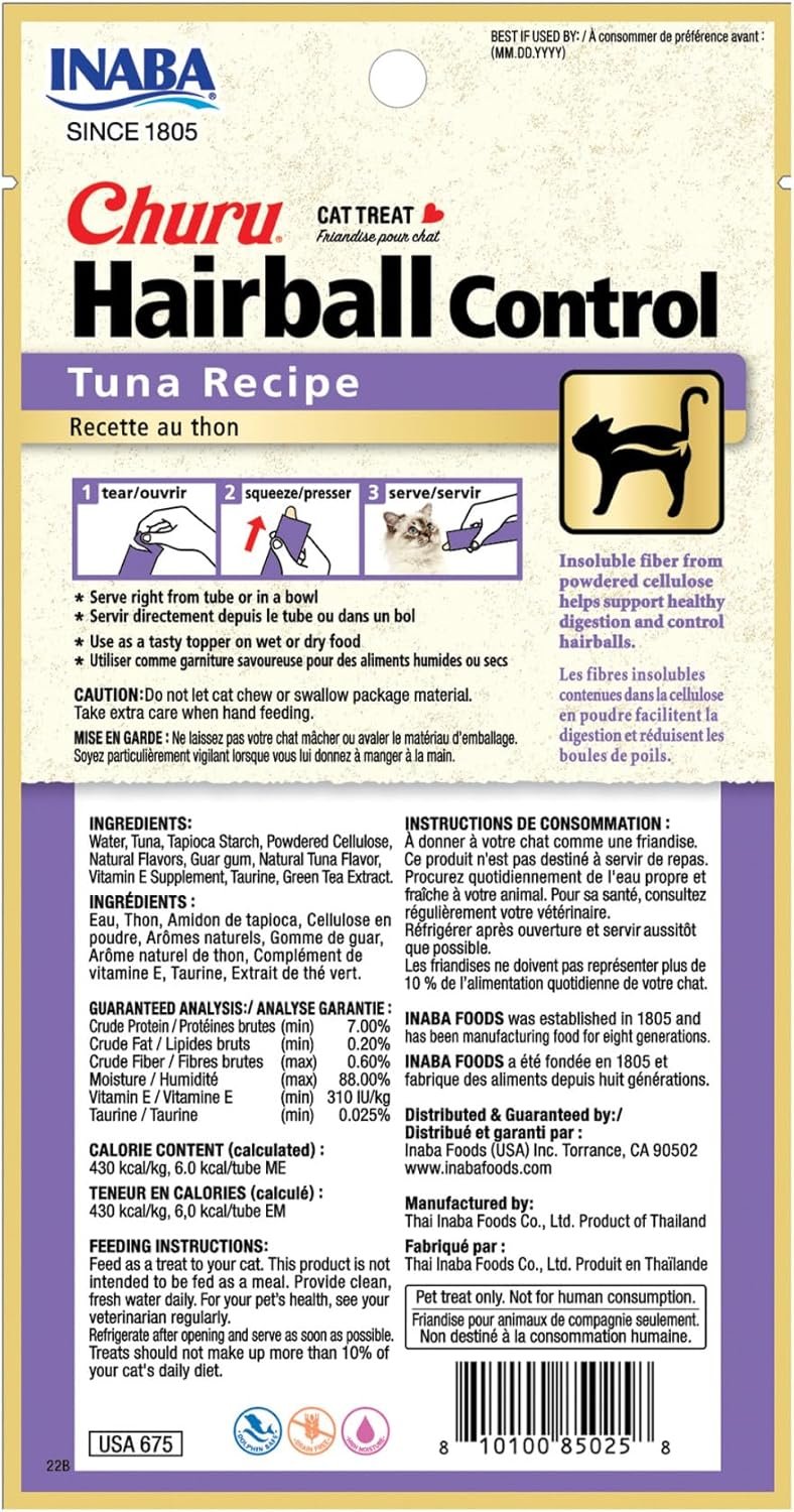 FUN AND FUNCTIONAL: A first-of-its-kind, creamy purée treat designed to aid with hairball control. Our original Churu formula with an added insoluble vegetable fiber to support healthy digestion and control hairballs
