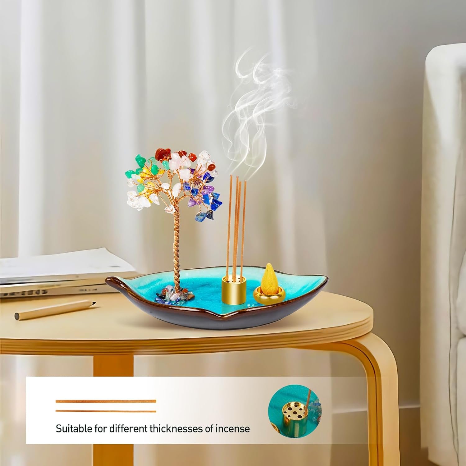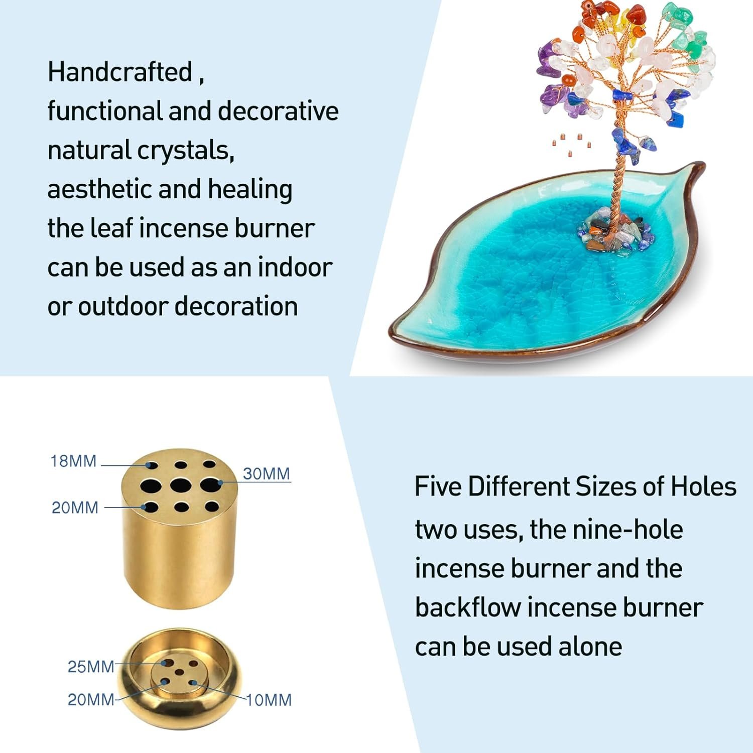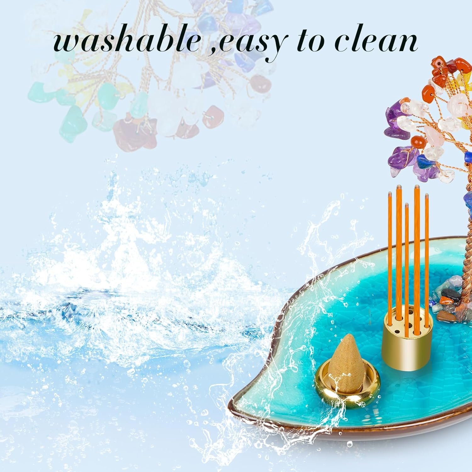 .You Will Receive: 1 pcs beautiful crystal stone money tree Incense holder, 1 pcs nine-hole incense stick, 1 pcs backflow incense holder , This item is composed of high-quality crystal gravel, blue lotus leaf tray incense holder. It is beautiful and practical. It can catch the incense ashes well and easy to clean