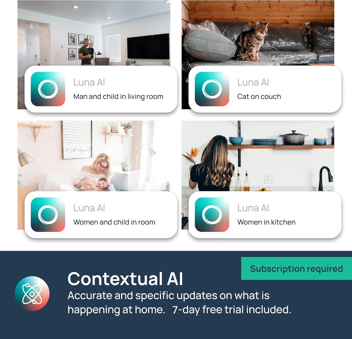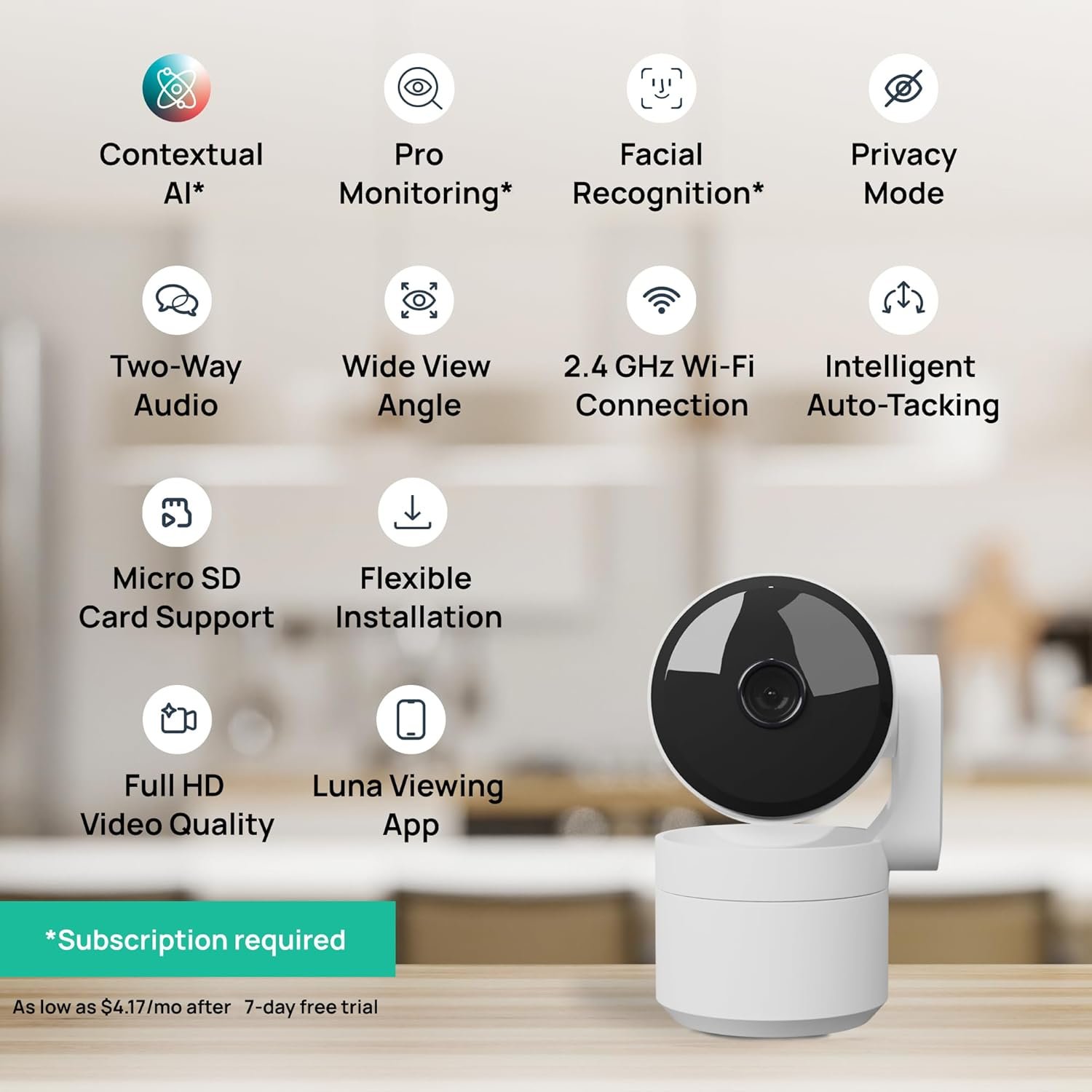 Intelligent AI Notifications w/ Subscription: 7-day FREE trial included–as low as $4.17/mo. Our AI provides instant descriptive notifications of exactly what’s happening– No more dumb “motion detected” alerts. Stay informed about things that really matter with this indoor camera