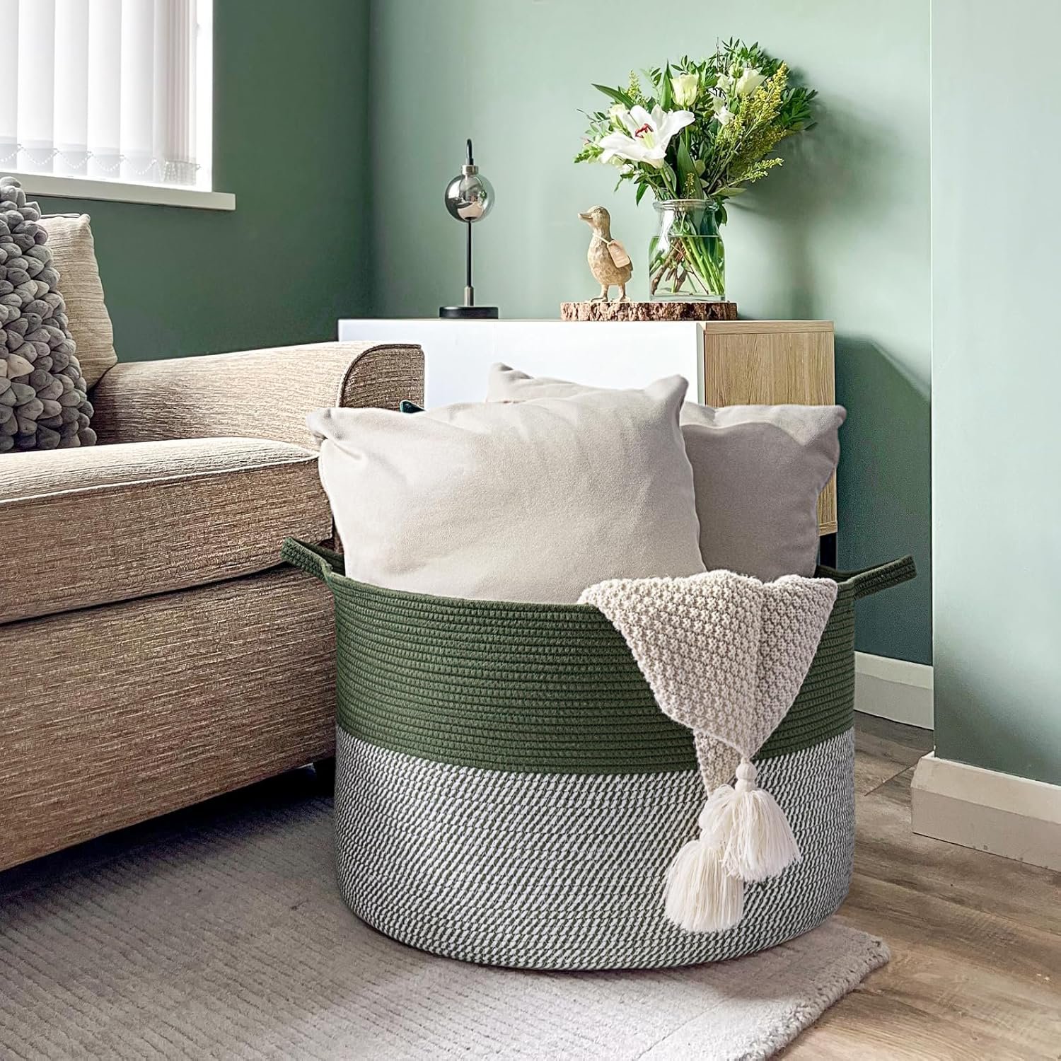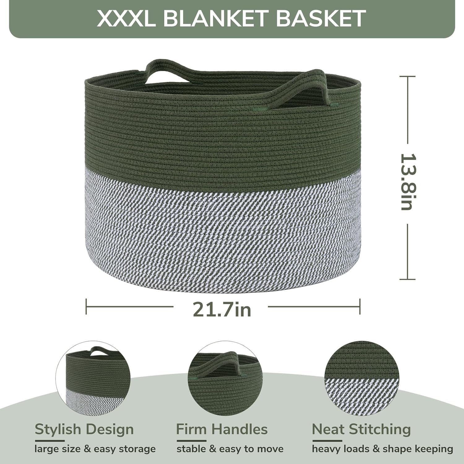 INDRESSME Large Laundry Storage Basket, 21.7 x 13.8 Blanket Baskets for Organizing Decorative Rope Basket Living Room Bedroom Nursery Toy Storage Basket for Colthes Towel, Empty Gift Basket, Green
