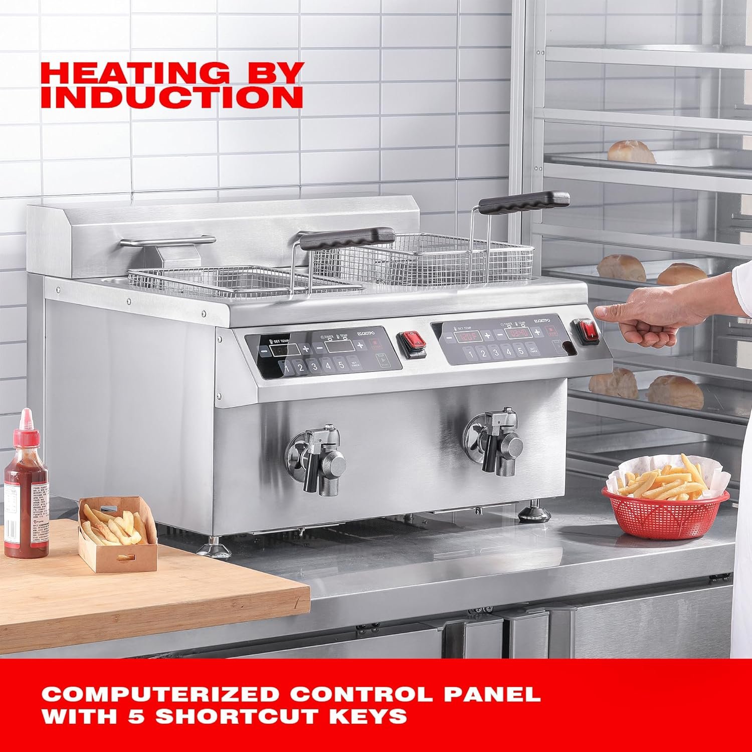 Simple and Intelligent Operation: The electric fryer has a computerized control panel with temperature control and 60-mintute timing. A additional temp probe allows you to see the real-time temp. Intelligent features help users keep track of the cooking progress. It has a one-touch pre-set menu function. 5 shortcut keys enable you to preset any countdown timer and use it to customize your one-touch recipes