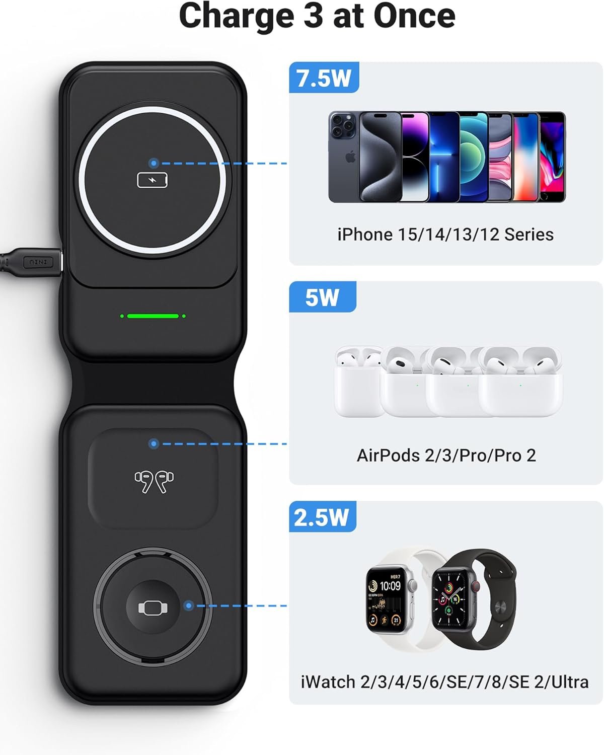 Fit Perfectly to Apple Ecosystem: Its 7.5W output works flawlessly with iPhone 16 15 14 13 12 11/Pro/XS/XR/SE/8; 5W for AirPods 2/3/Pro/Pro 2, and 2.5W for Apple Watch 2/3/4/5/6/SE/7/8/9/SE. 【Note: Magnetic suction feature is only available for iPhone 12 onwards series】