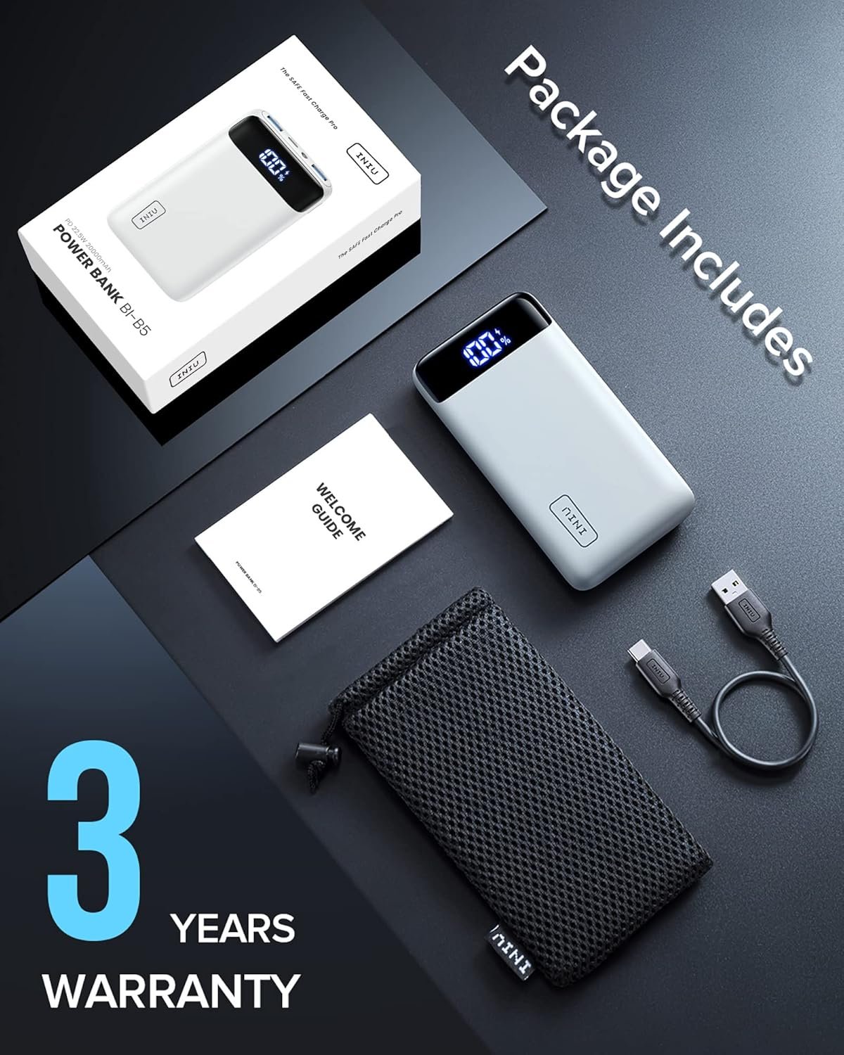 What You Get: INIU 20000mAh power bank*1, USB C cable*1, travel pouch *1, welcome guide*1. Within 3 years, for any quality issue, directly reach us, we will send you a new one!