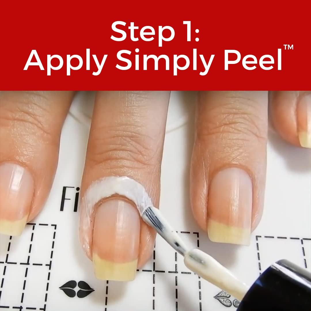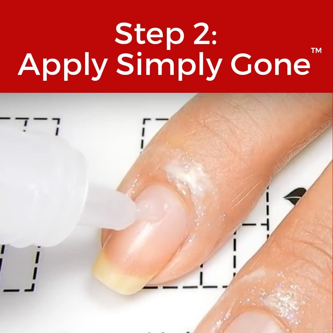 Apply Simply Peel to the skin around your nails and allow to dry. (See video below for tips on applying Simply Peel)Squeeze a tiny amount of Simply Gone onto your nail plate (about the size of the head of a quilting pin – remember, a little goes a LONG way) and use the tip of the bottle to carefully spread it over your nail. Repeat on all 10 fingers.Simply Gone works fast. After you’ve applied Simply Gone to each of your nails, start back at the first finger you applied it to and begin to remove Simply Gone. IMPORTANT: Do Not Leave On Longer Than 1 Minute.Using a cuticle removal tool–gently, gently, gently–scrape back and stop right at the proximal fold. Glide the tool against the surface of your nail plate. The remover solution will have dissolved the cuticle so downward pressure is unnecessary (and too much pressure can bruise your nail plate or cause other damage).The removed cuticle and cream will build up on the back of the removal tool. Wipe that onto a paper towel.Once you are finished removing your cuticles from your nails, remove the latex barrier and rinse your hands with water.