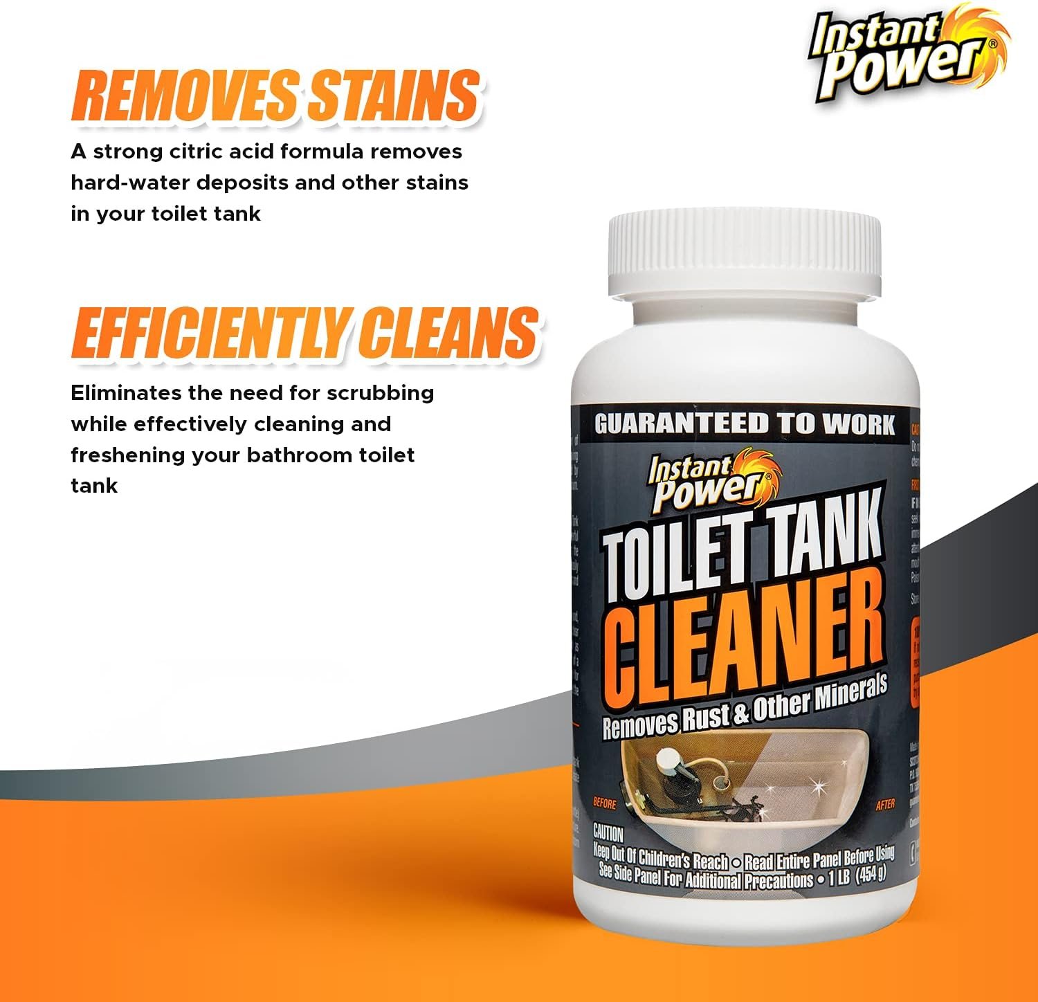 REMOVES STAINS: Put less elbow grease in cleaning your bathroom toilet tank; Thanks to its strong citric acid formula, Instant Power’s Toilet Tank Cleaner removes hard-water deposits and other stains in your toilet tank