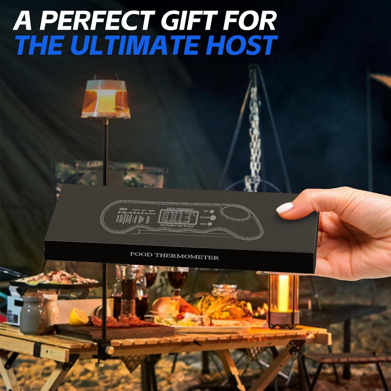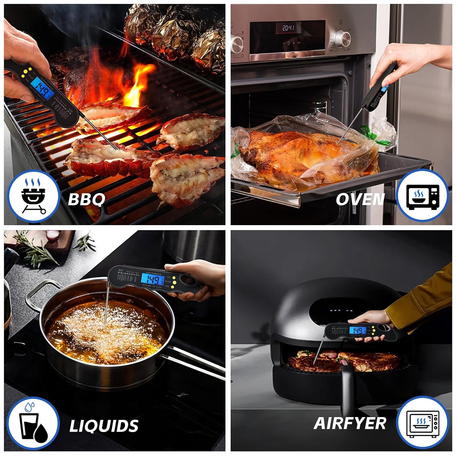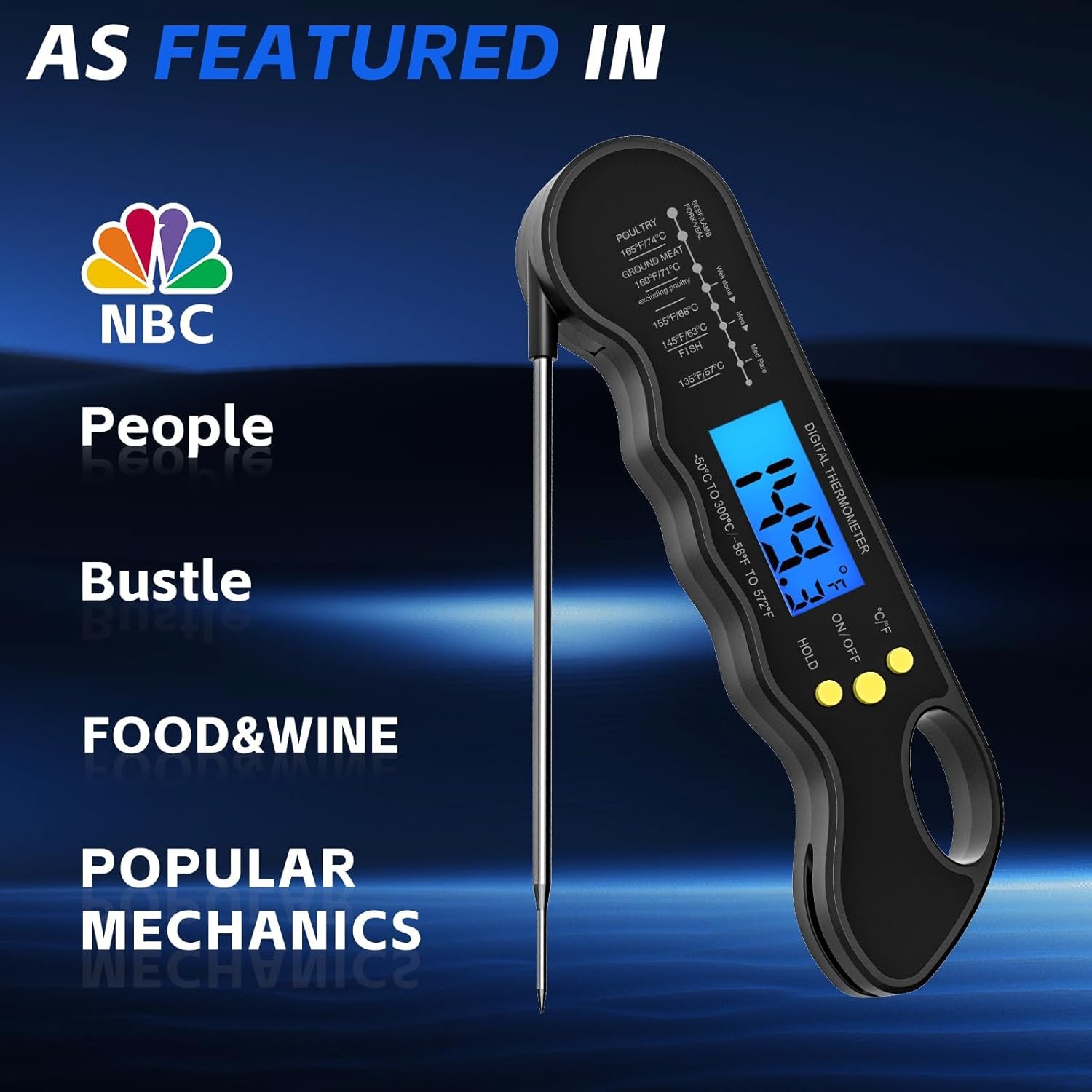 CLEAR AND REVERSIBLE DISPLAY – You will get the clarity temperature with the bright and large LCD screen, also you can read the food temperature in the dark while grilling with backlit button! Or press for to switch ON/OFF. And the Exclusive auto-rotating display rotates automatically depending on how the instant read food thermometer is held and enables you to read the numbers from any direction which is convenient for right or left-hand persons to use, letting you enjoy every step of cooking!