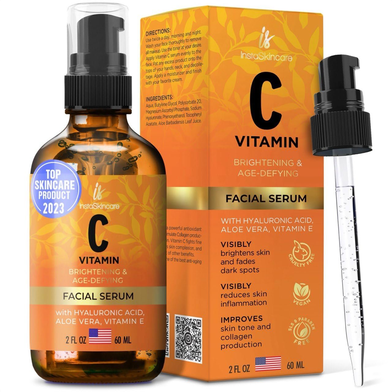 InstaSkincare Vitamin C Serum for Face and Eyes with Hyaluronic Acid and Vitamin E – Brightening Serum, Dark Spots, Eye Area, Wrinkles 2Oz