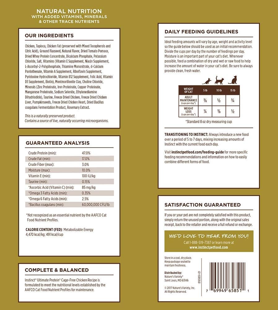 HIGH PROTEIN GRAIN FREE CAT FOOD WITH CAGE FREE CHICKEN: Instinct Ultimate Protein dry cat food has up to 3x more real chicken & 95% of the protein comes from chicken vs. vegetables or animal meals. Unmatched digestibility for optimal nutrient absorption.