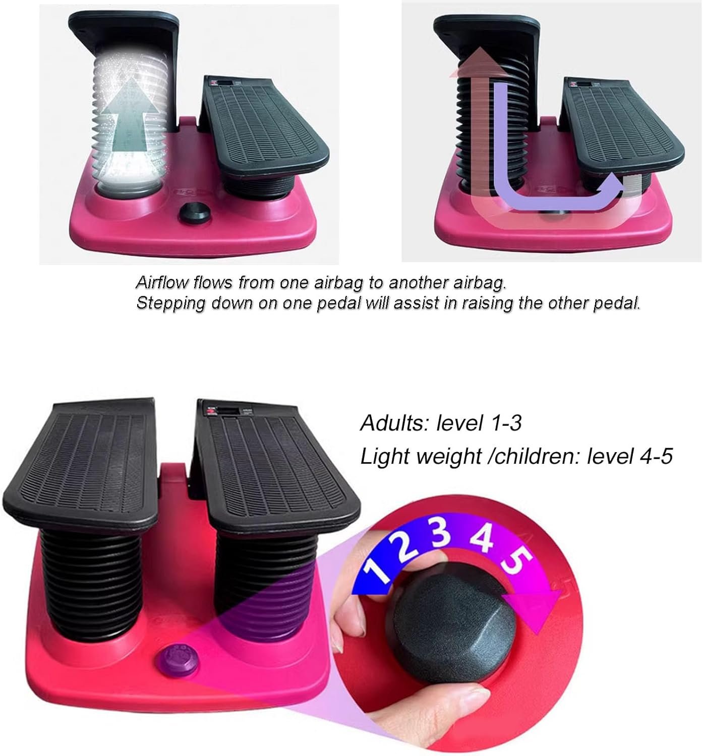 Before use, stepper exercise machine is always necessary to inflate the bellows. Push and gold in the resistance dial, located between the pedals, while gently pulling us on the pedals to fill the bellows, then release the dial. Pushing and holding in the dial will allow air to enter or exit the bellows system (depress and hold down the resistance dial to allow air to flow into the bellows)