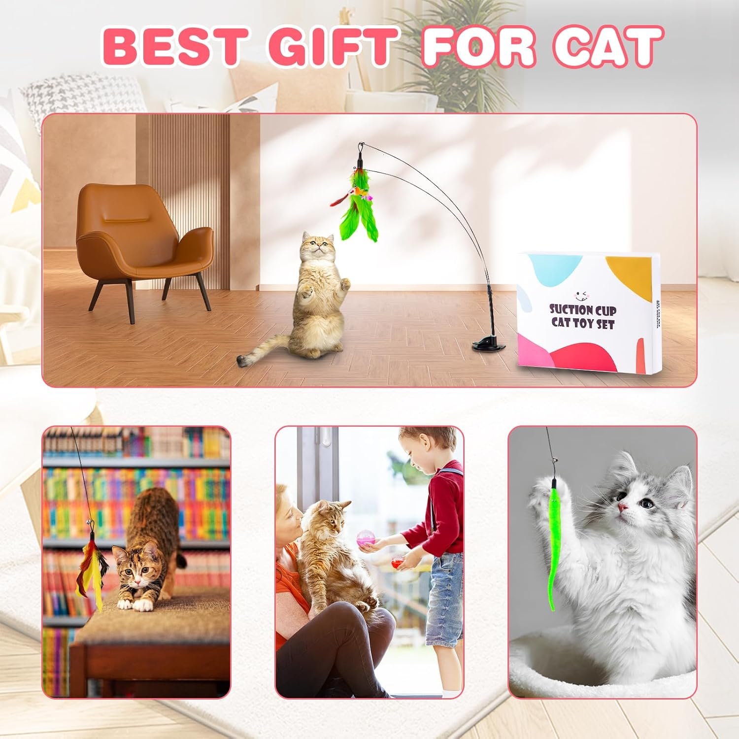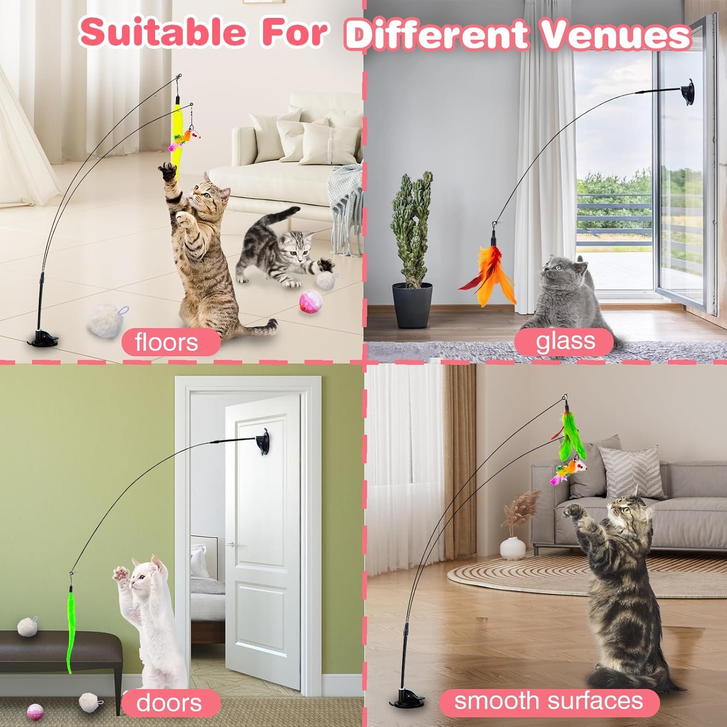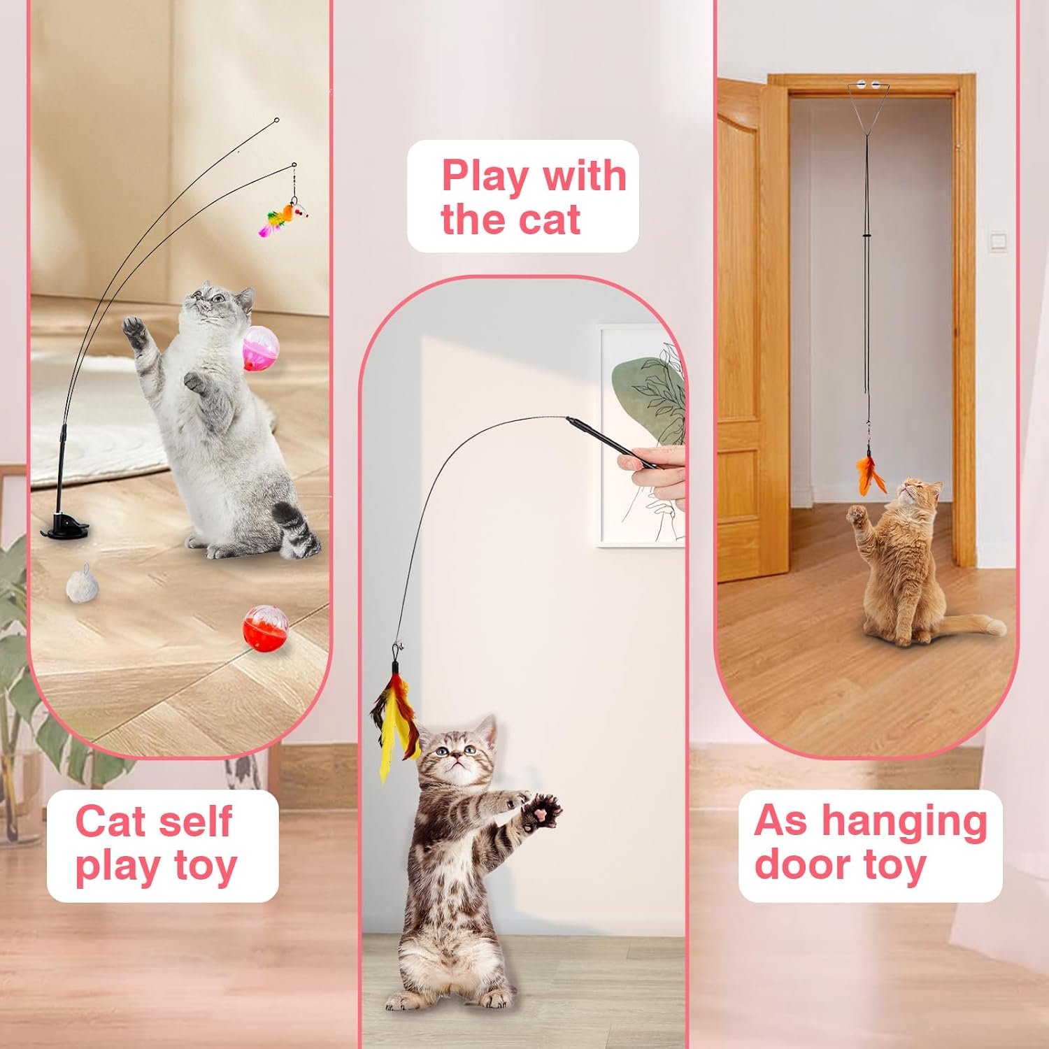 [3 Interactive Modes] Cat toys interactive for indoor cats are designed to keep your furry friend engaged and active. You can stick indoor cat toys to the floor or glass for the cat to play with by itself. You can also use the rod as a cat toy wand. Cat wands will increase your interaction with the cat and make you and the cat more intimate. Interactive cat toy set also has a hanging door accessory. Cat string toy can be used as cat door toy and an everyday best cat toys for bored cats
