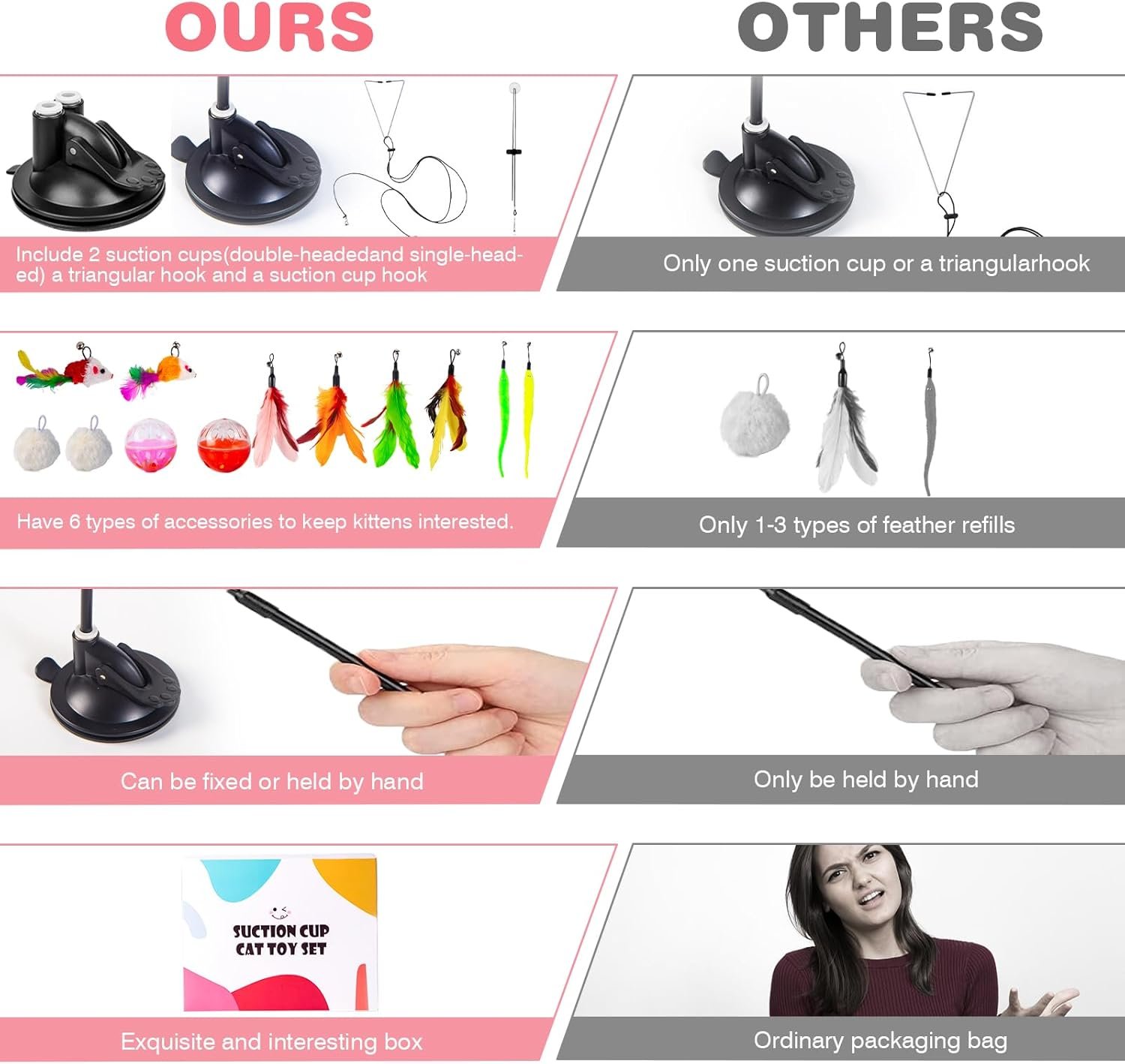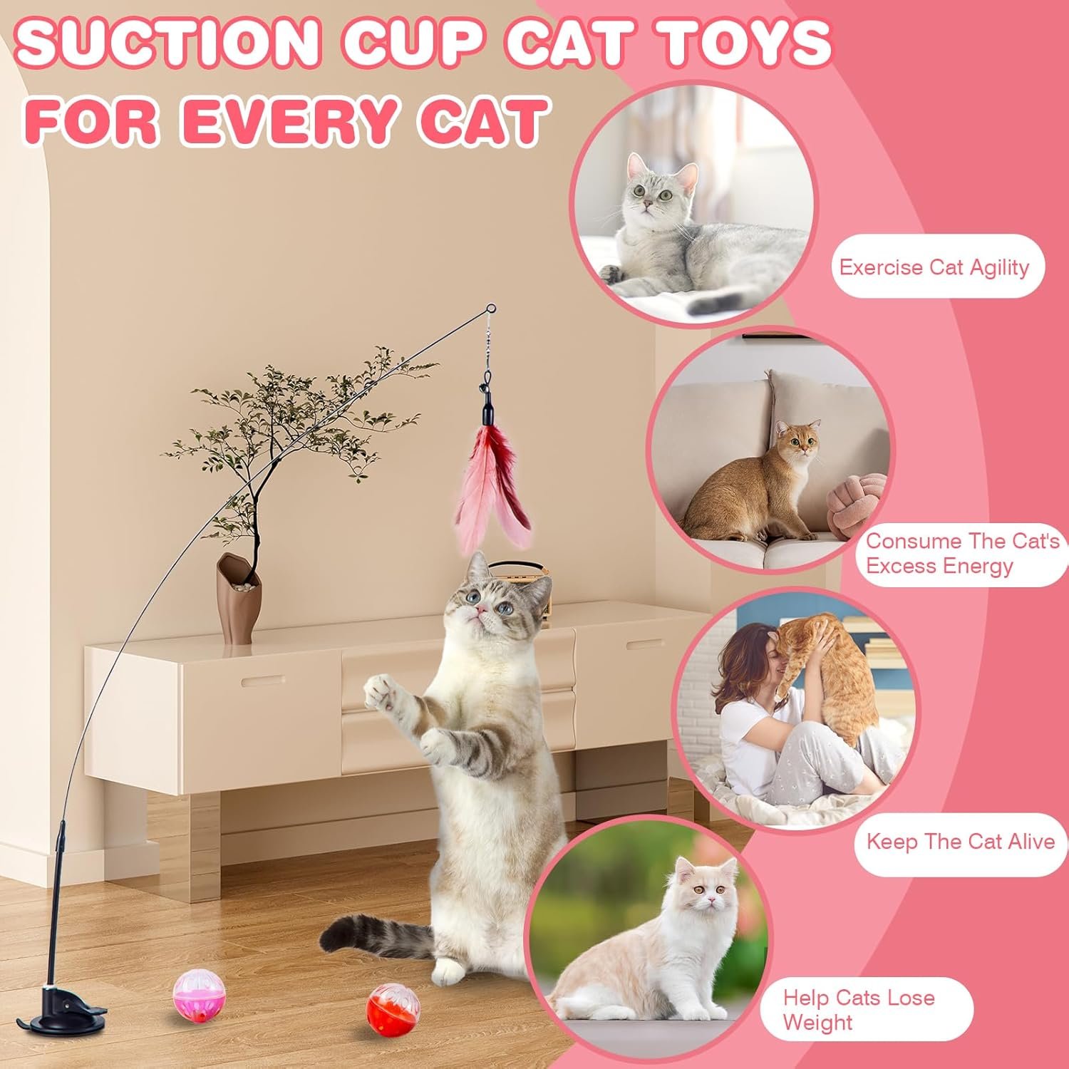 [Precautions for cat suction cup toys] Cat fishing pole toy is great for kittens and cats of all ages and sizes! 2 suction cups inside cat wand toy attachments allow you to stick sucker cat toys to multiple places at the same time. Choose a smooth and clean area and stick cat toy suction cup on it. If the suction cup of cat interactive toys for indoor cats is dirty or not sticky, clean the base of cat toys suction cup to restore the stickiness. Let sucker cat toy dry naturally after cleaning