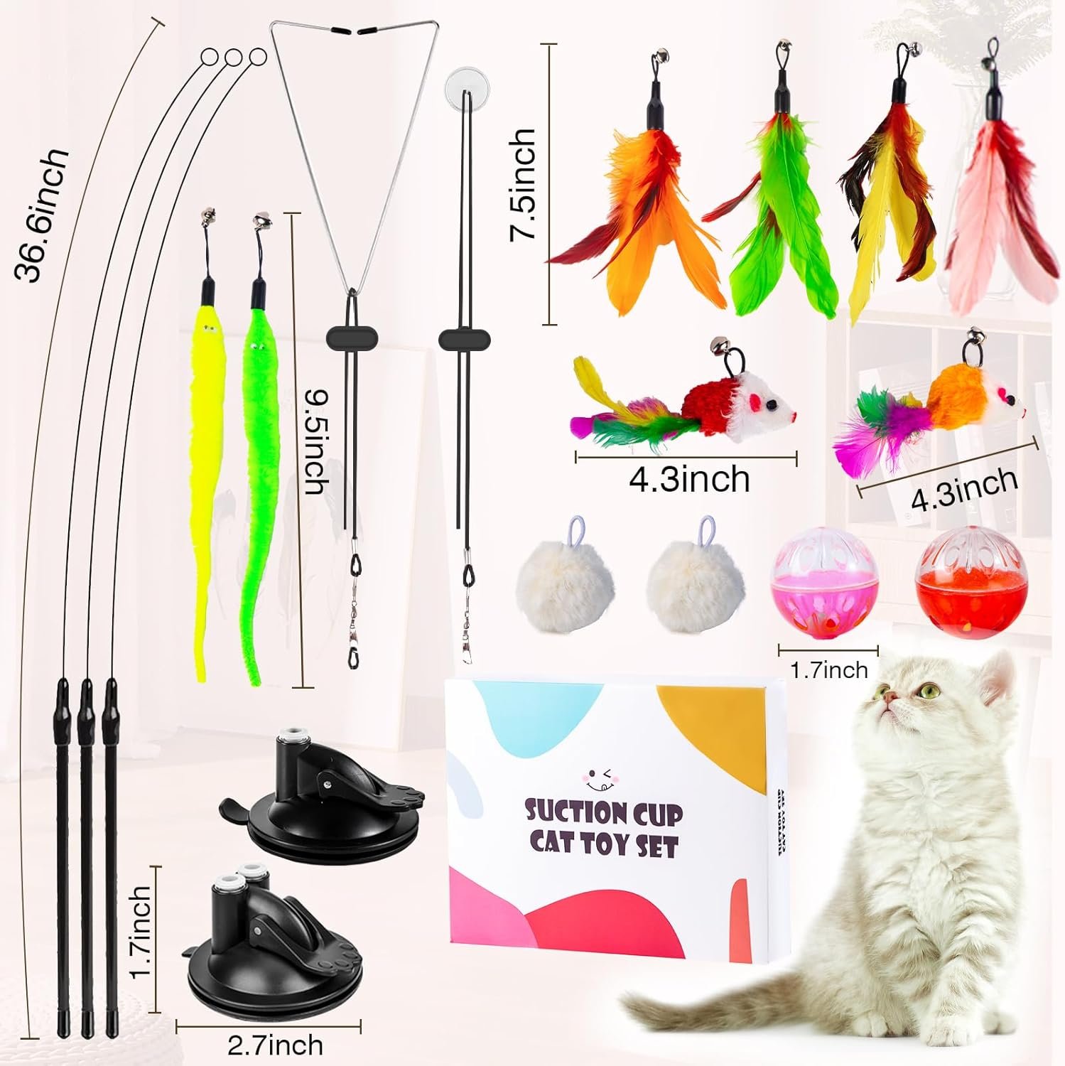 [Cat Toys Set] Interactive pet toys has a beautiful packaging box, you can give interactive feather cat toy as a gift to your cat. A total of 12 replacements cat toys. Cat toy contains 1 single rod suction cup cat toy, 1 double rod suction cup cat toys, 4 different styles of cat feather toys, 2 colorful cat mouse toys, 2 cat worm toys, 1 stick cat toys, 1 triangular hook cat toy door hanger, 2 fur cat scratching balls, 2 random plastic cat treat balls. Cat accessories give your cat more options