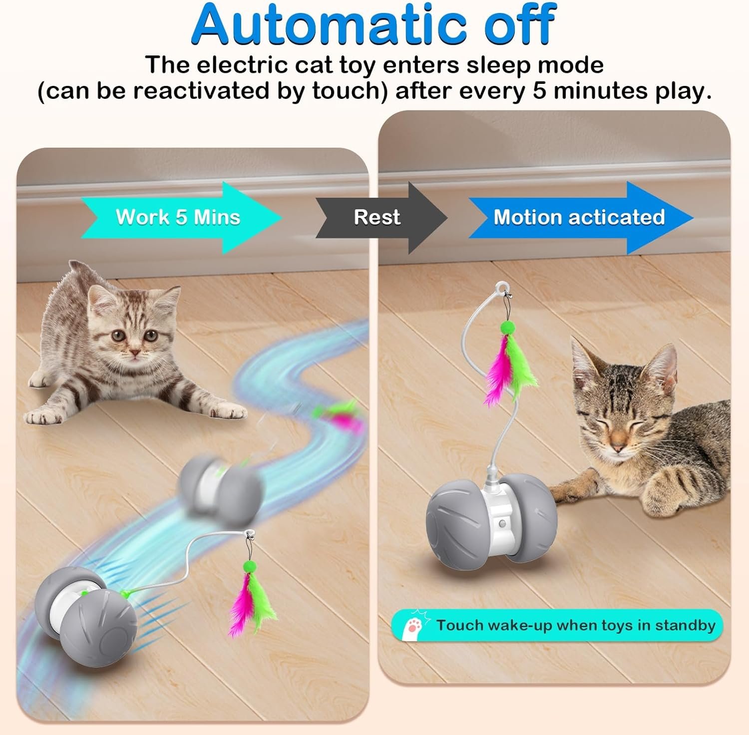 Indoor cat toys enters into the standby automatically every 10 minutes. It can be re-activated upon being touched