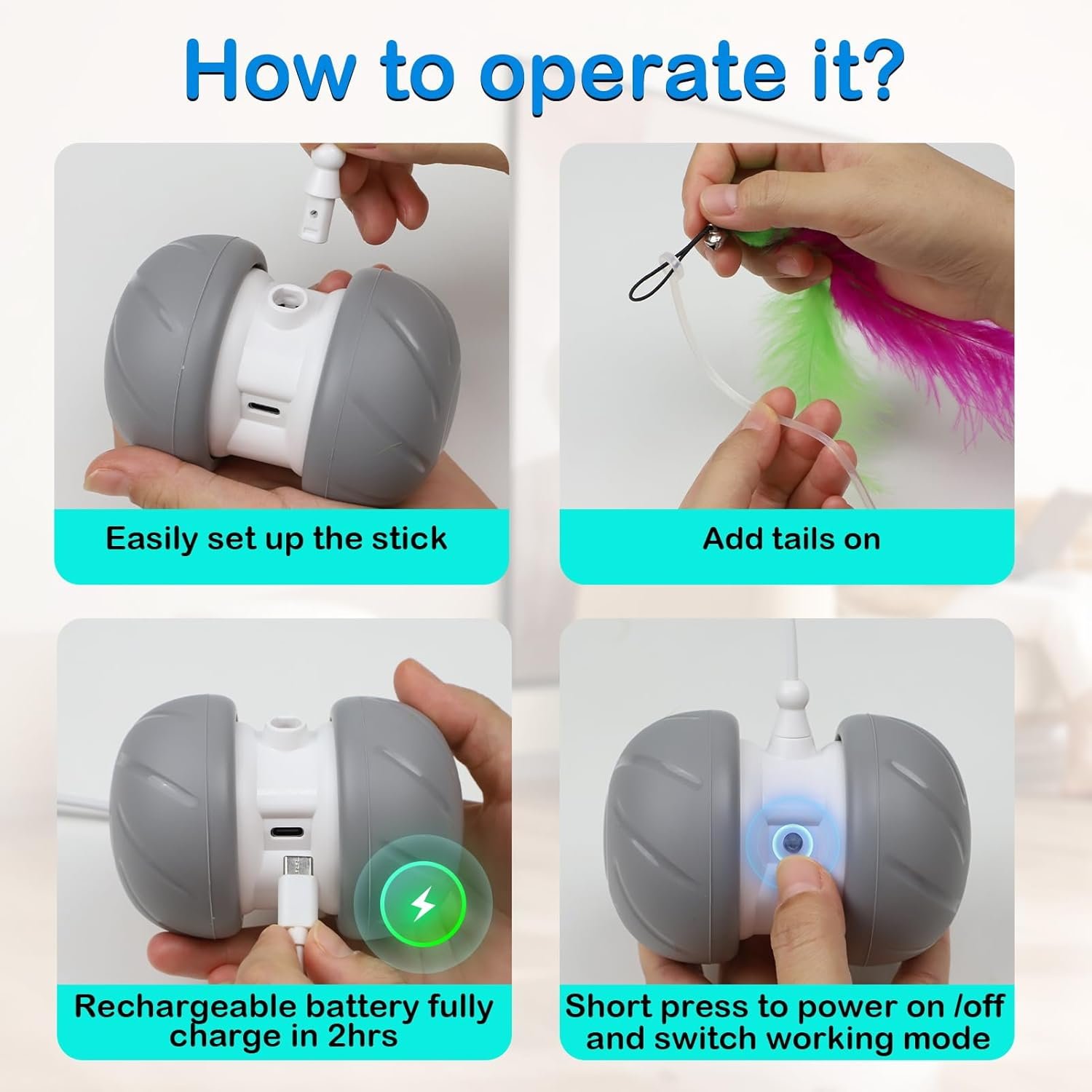 Extra long metal sticks with flying feathers will create great fun for your cat and family, when the robot car move forward, backward, randomly and spin 360-degree. Hanging tails of the toy are designed to stimulate your cat’s natural hunting instincts.