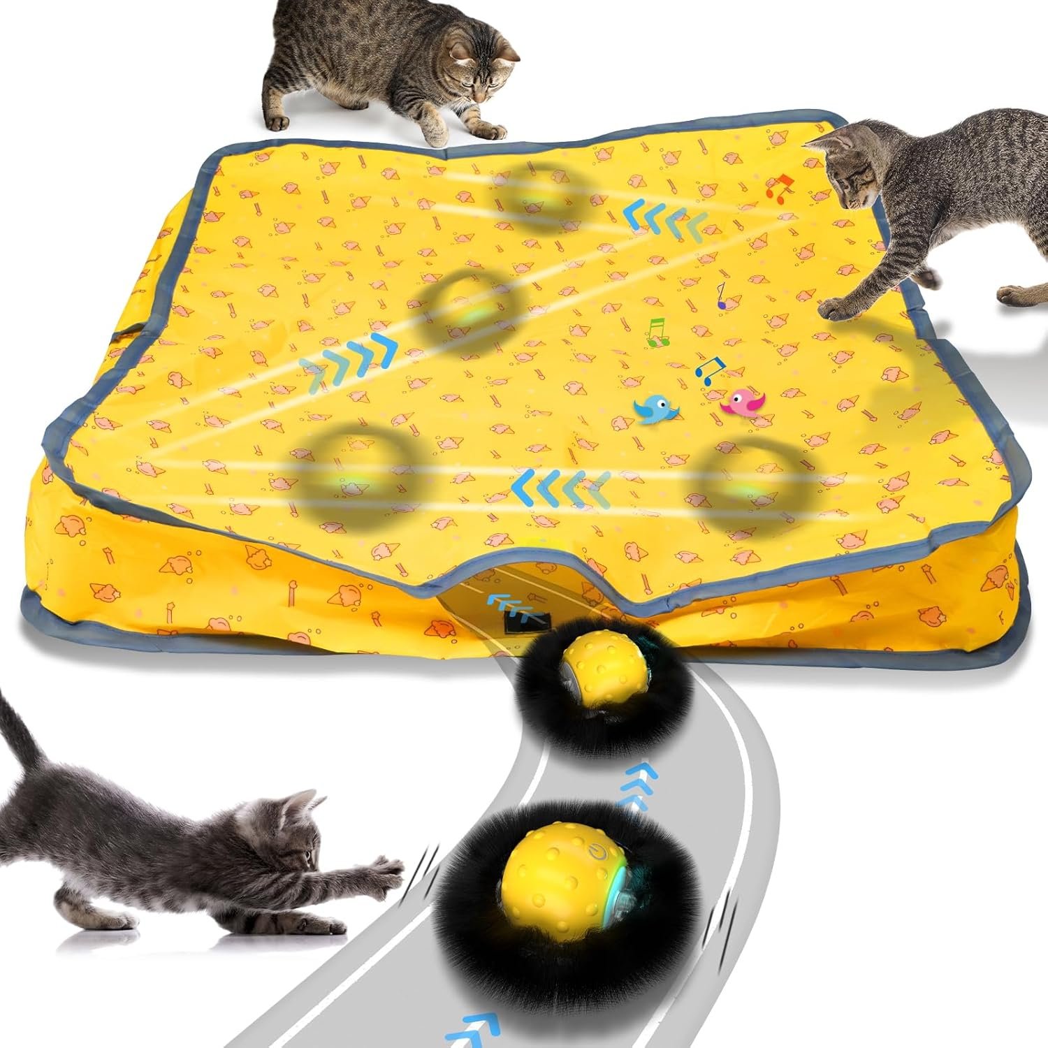 Cat ball toy + Hiding cover + Chirping bird sound,get together with cat’s favorite toysFast mode, slow mode, interactive mode (only responsive when touch)Automatic off every 5mins working, make kitty get rest Motion cat toys could be waked up by pets touched, playmates with cats when owners outSuper power cat ball, running easily on carpet,floorRechargeable battery inside