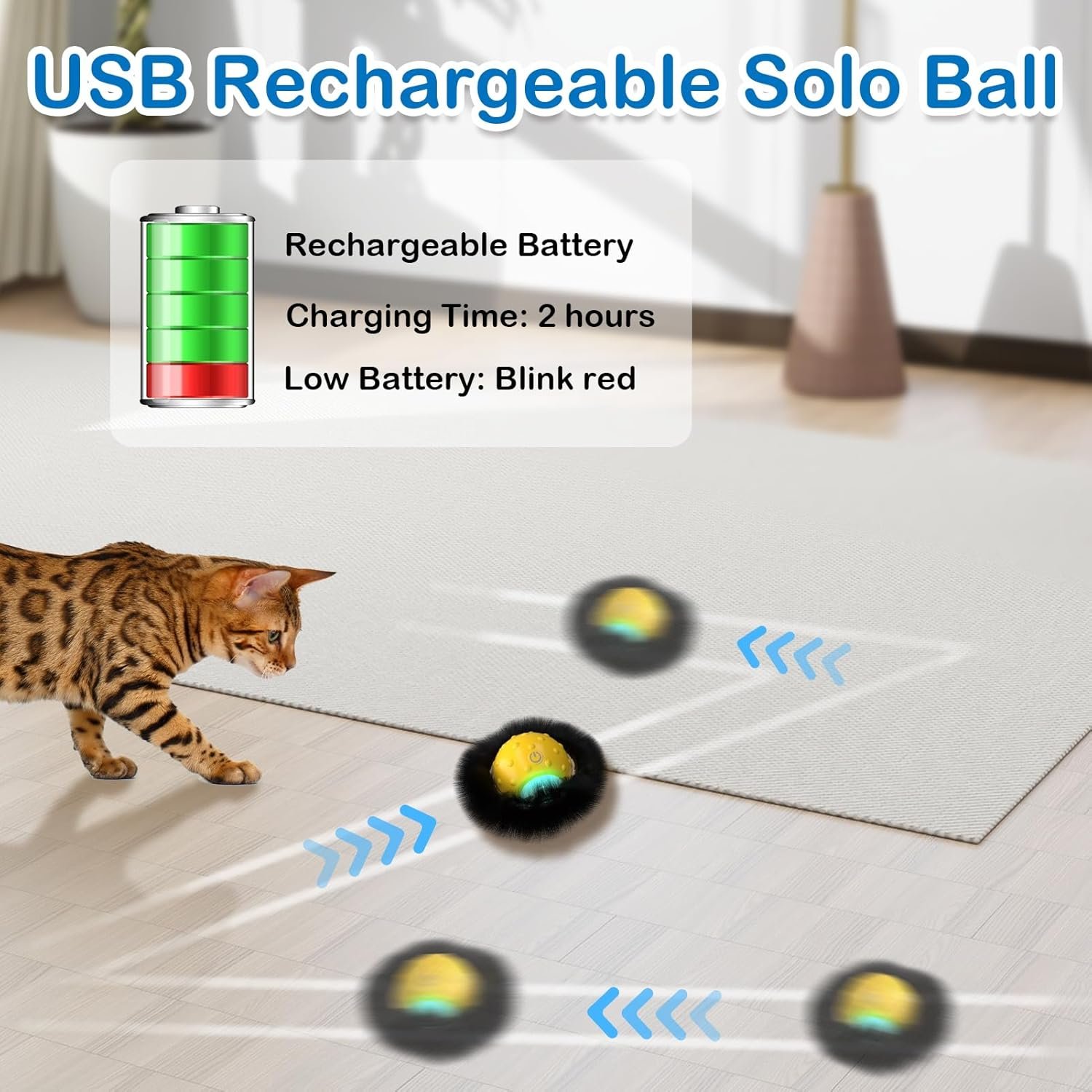 USB Rechargeable Cat Toy: This interactive cat ball comes with Type-C cable,easily fully charged in 2 hours. Reduce battery waste.USB cable is included in the package.An ideal present for the holiday, birthday, Thanksgiving, Halloween, Christmas – or any day!