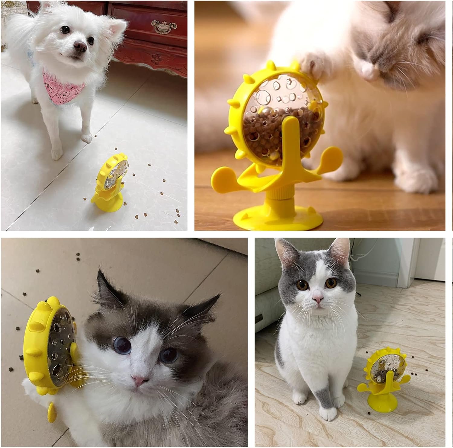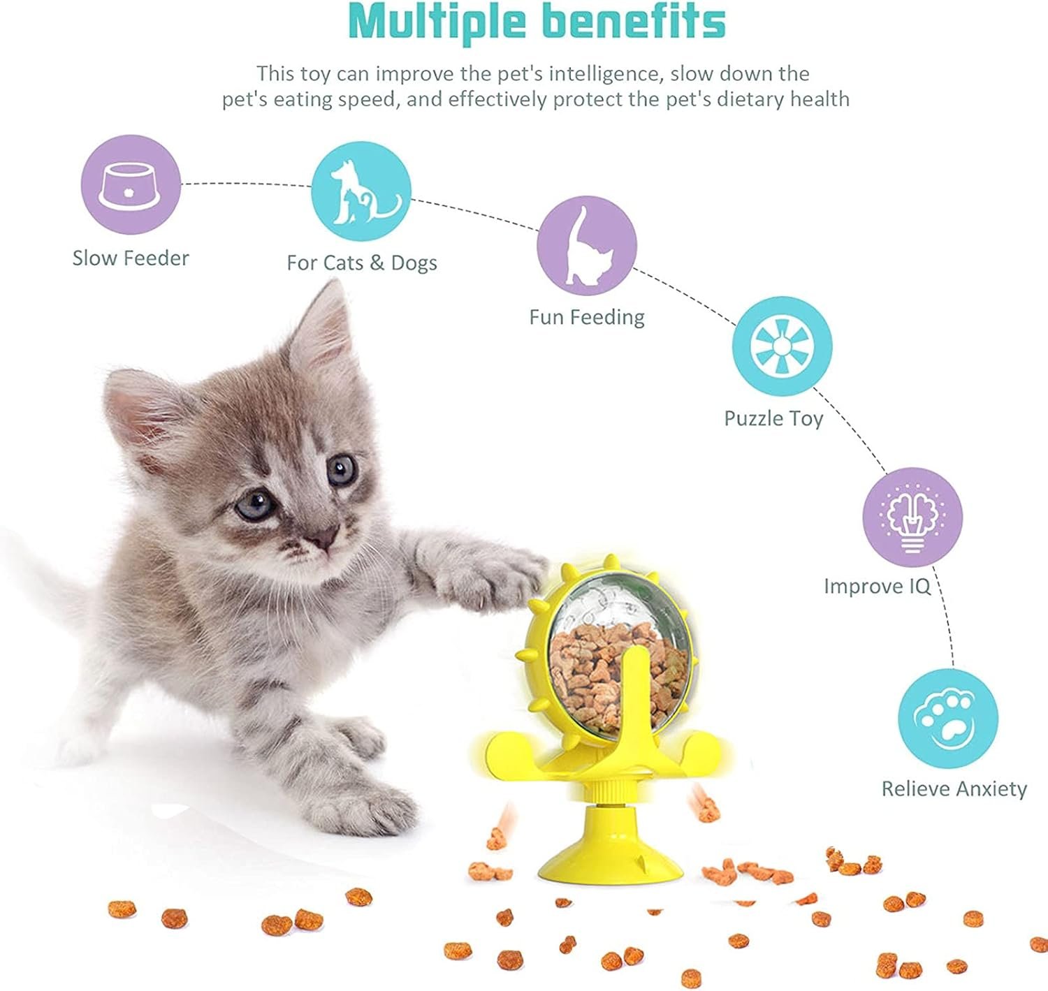 🐈【 Safe and Nontoxic】: This cat windmill food dispenser is made of high-quality ABS and TPR materials, so it is resistant to bite and aging, safe and non-toxic.This toy can improve the pet’s intelligence, slow down the pet’s eating speed, and effectively protect the pet’s dietary health.