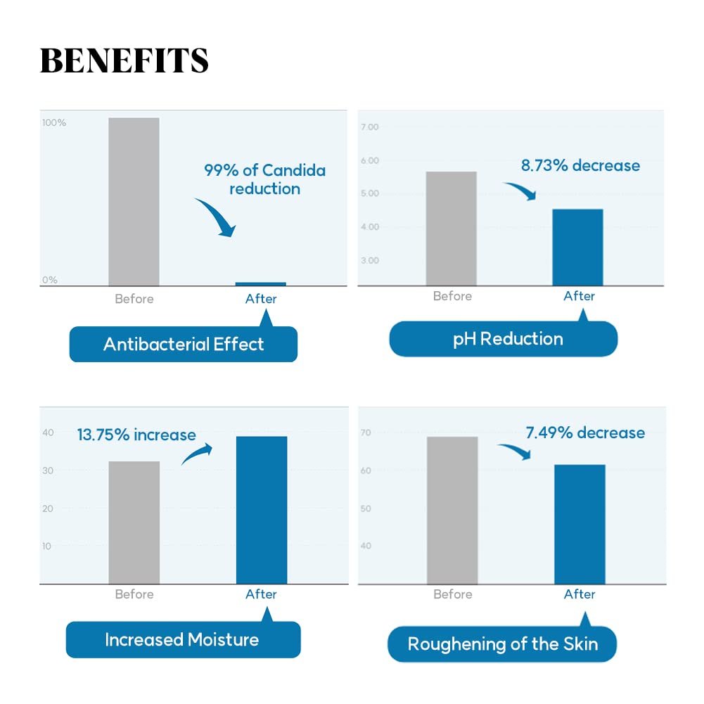 Scientifically Backed Results: Trust in the power of science. Clinically proven benefits through rigorous trials include pH balancing, candida reduction, skin moisturization, and strengthening of the natural barrier.