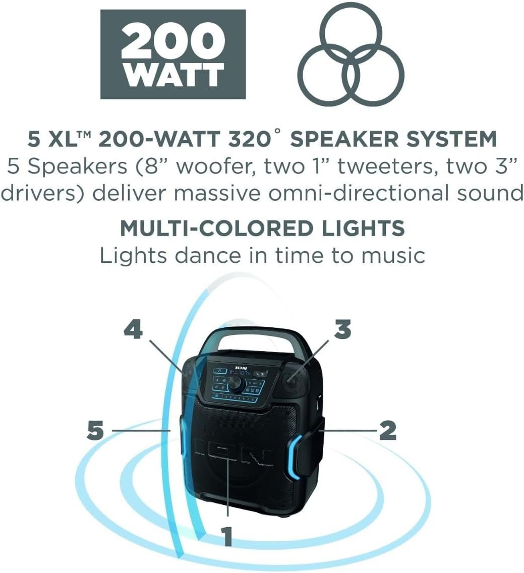 5 XL️ 200-WATT 320˚ SPEAKER SYSTEM – [INSET] 5 Speakers (8” woofer, two 1” tweeters, two 3” drivers) deliver massive omni-directional sound