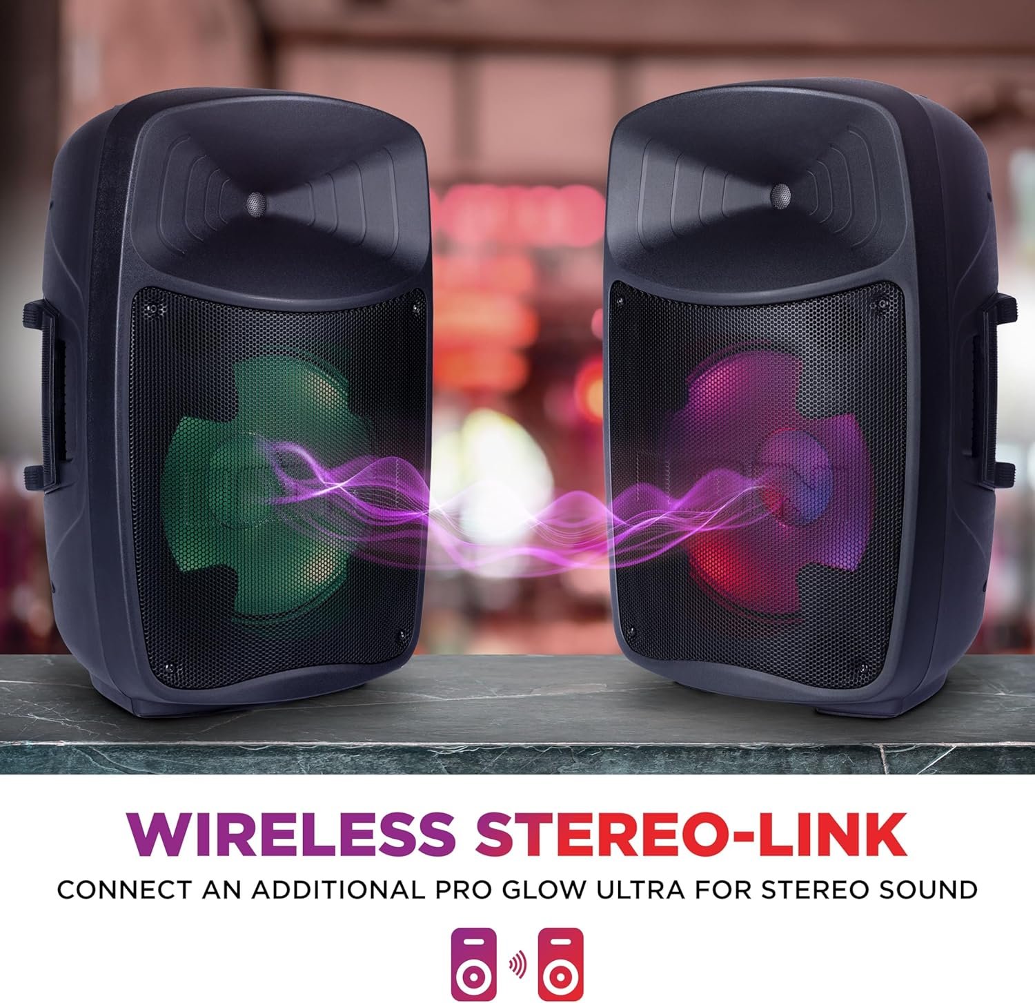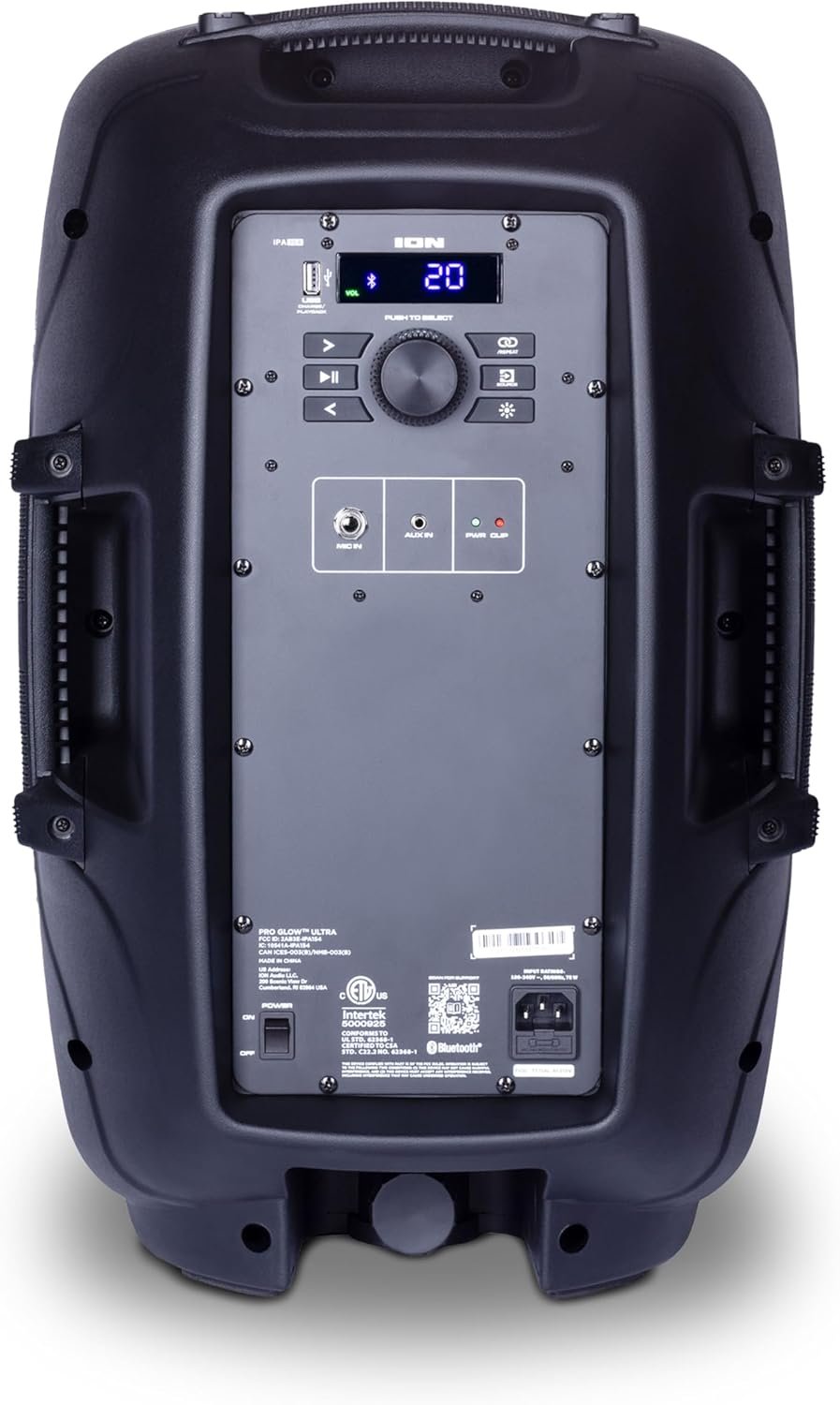 ION Audio Pro Glow Ultra is a high-power 300W bi-amplified PA system with lights and Sonic Wide Audio which provides premium sound to the front, left, and right of the speaker. Driving a 12” woofer and a 1” tweeter, this compact PA speaker is easy to set up and flexible enough to handle any time you need a powerful portable wireless sound. The woofer lights glow in multiple colors and can be synchronized with the music for exciting visual effects.