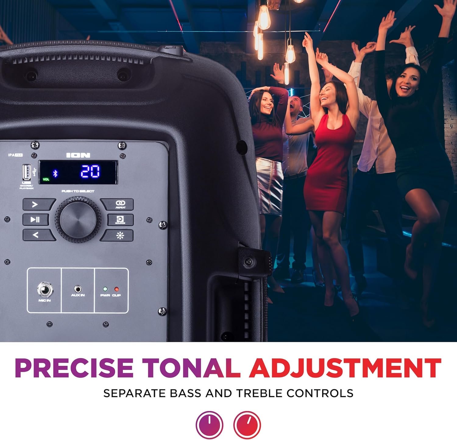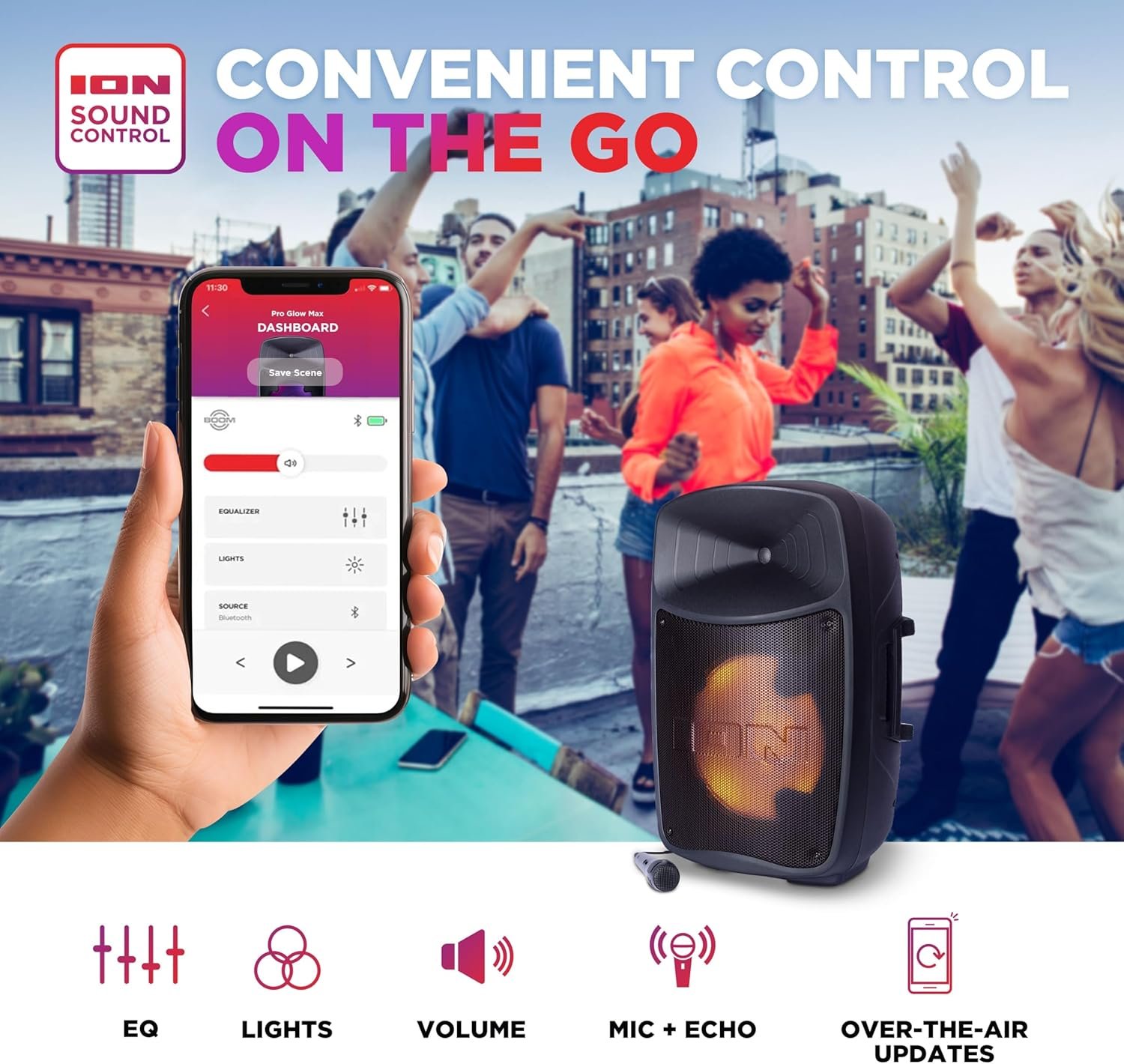 Pro Glow Ultra has ION’s one-touch user interface allowing precise tonal adjustments via one simple control knob. You can download the ION Sound Control app to control the lighting effects and audio, ensuring complete customization of your preferred sound.