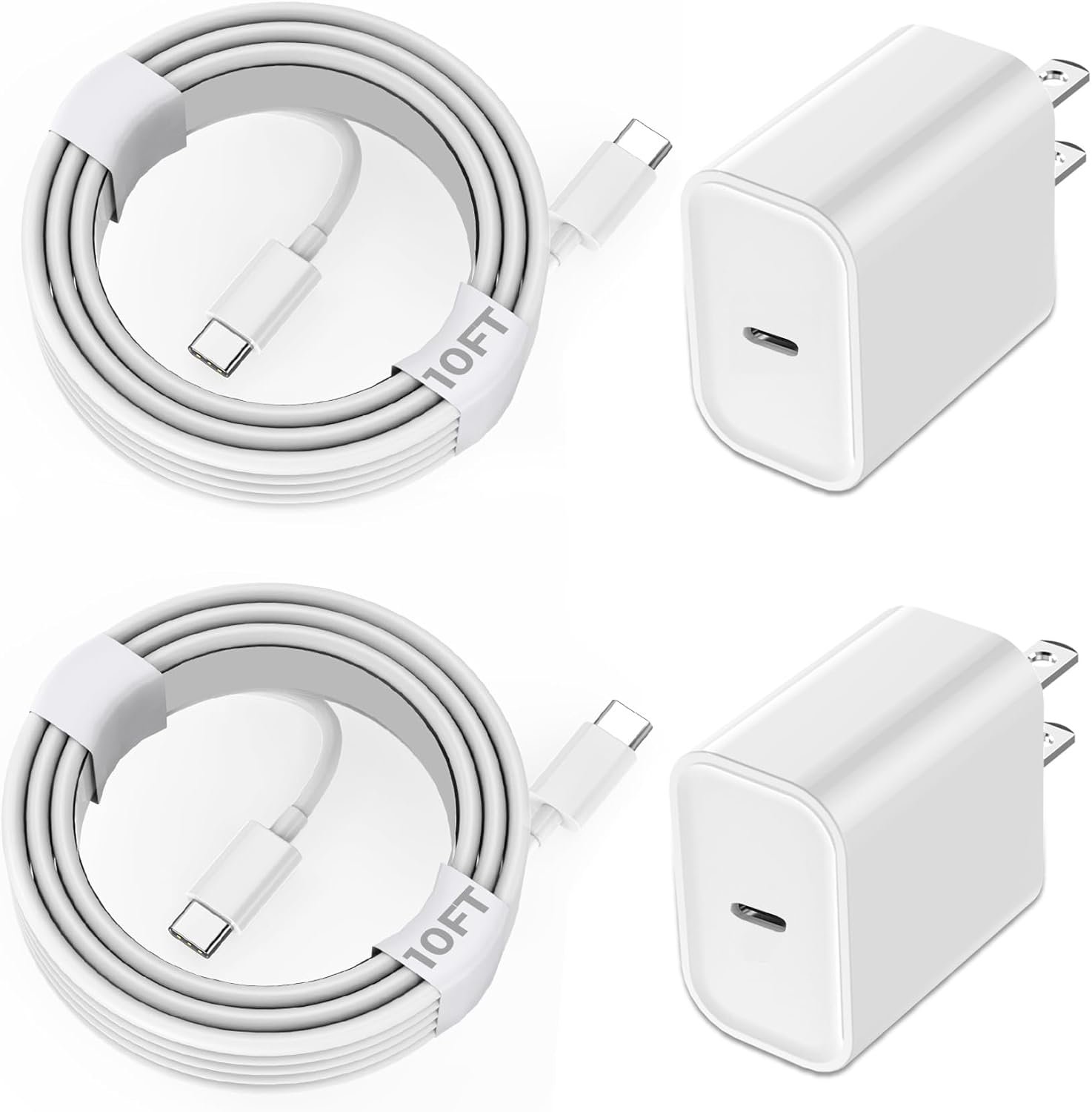 iPhone 15 Fast Charger, 2 Pack 20W PD USB C Wall Charger & 2 Pack 10FT Long USB C to USB C Cable for New iPhone 15 Series, iPad Pro/Air/Mini.