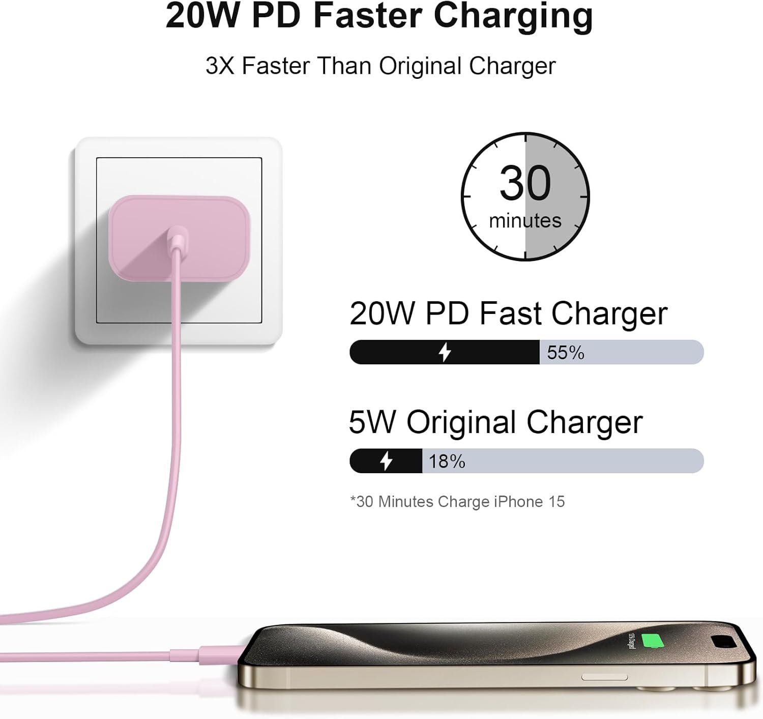 【20W PD 3.0 Fast Charger】20W PD 3.0 fast charger and 10ft USB-C to C cable, charge iPhone 16 15 to 55% in half an hour, which is 3× faster than with an original 5W charger