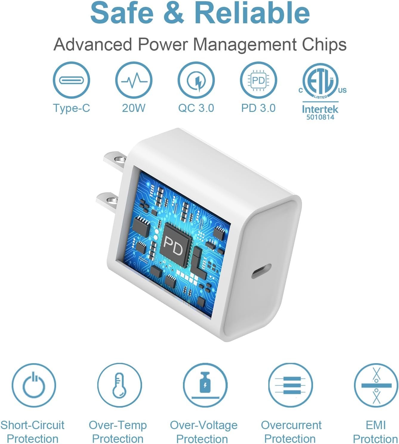 20 W Wall Fast Charger delivery is a new, universal multi-voltage charging standard that negotiates power output over a USB Type-C connection to safely and efficiently recharge a wide range of compatible devices.Built-in Safeguards:ETL, FCC, CE, ROHS certificated. Multi-charging protection keeps your device safe from over-current over-voltage over-heating & short-circuiting. exhaustive protection while charging.