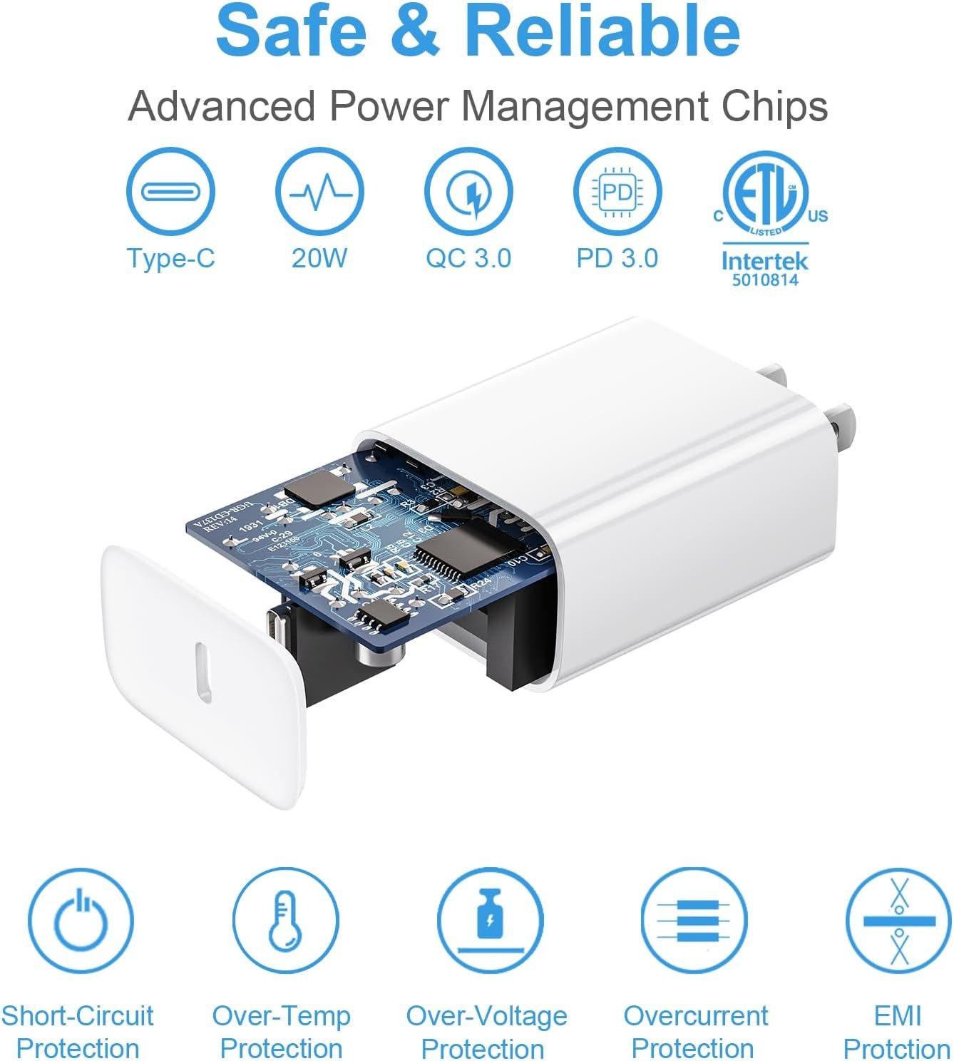 【Broad Compatibility 】Use the official USB-C lightning cable 20W USB C wall charger to access fast-charging iPhone 16/16 Plus/16 Pro/16 Pro Max/iPhone 15/15 Plus/15 Pro/15 Pro Max/ 2021/2020/2018 iPad Pro 12.9/11 inch,iPad Air 4, Mac Book Air 13 inch, Mac Book 12 inch, Gen 4/3, iPad Pro 11 Gen 2/1, iPad Air 4, Google Pixel 4/ 4 XL / 3a XL / 3 / XL / 2, Samsung Galaxy S8 S9 S10 S20 Plus, Note 10, LG and more.