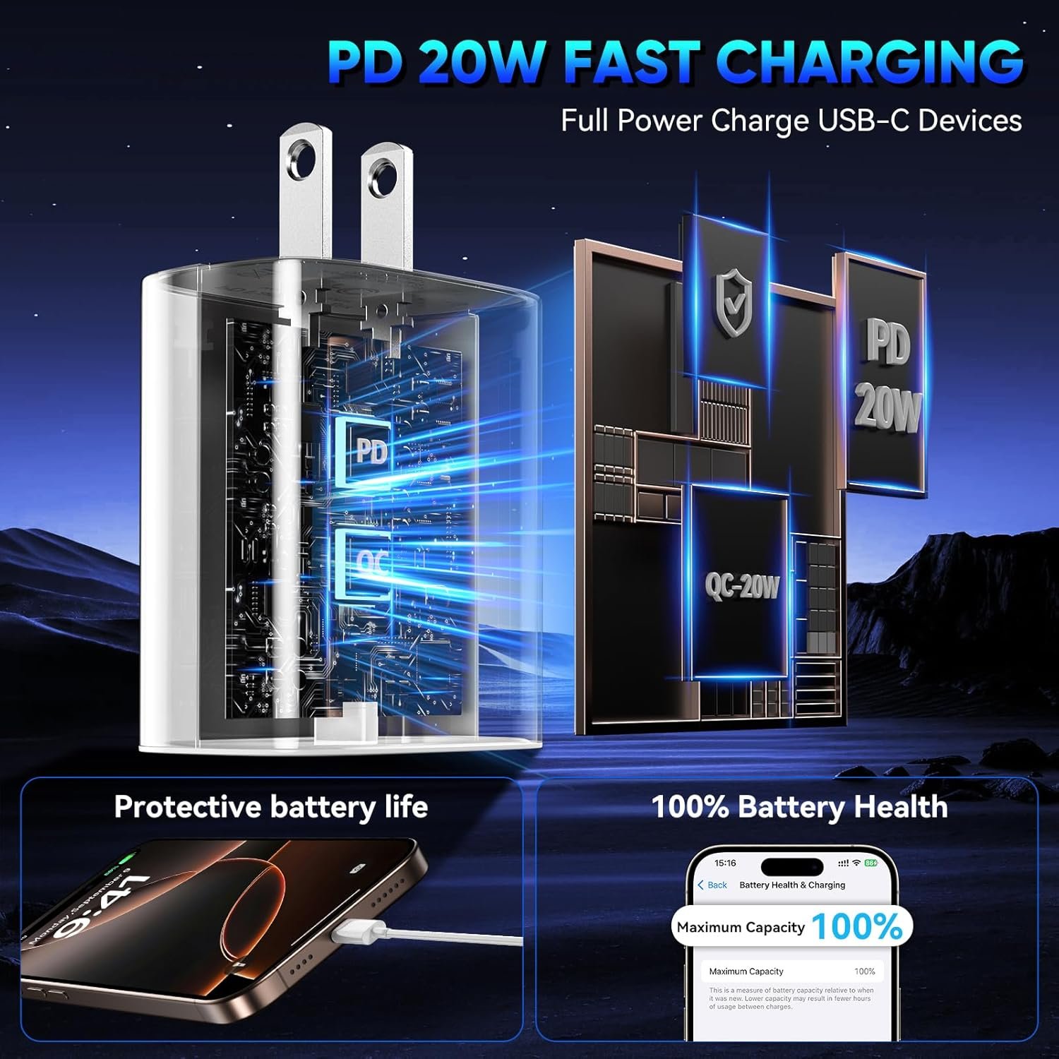 What You Get: 2 X 20W iPhone 16/15 fast charger, 2 X 10FT iphone 16/15 charger Type c charging cable. 18-month worry guarantee. if you have any questions, please contact us,We promise to solve your problems within 24 Hours.(Please note:About 80% Limit: With iPhone 16/15 models, to choose between Optimised Battery Charging, 80% Limit and None, go to Settings > Battery > Battery Health & Charging > Charging Optimisation and Choose to cancel charging optimization to lift the 80% limit)