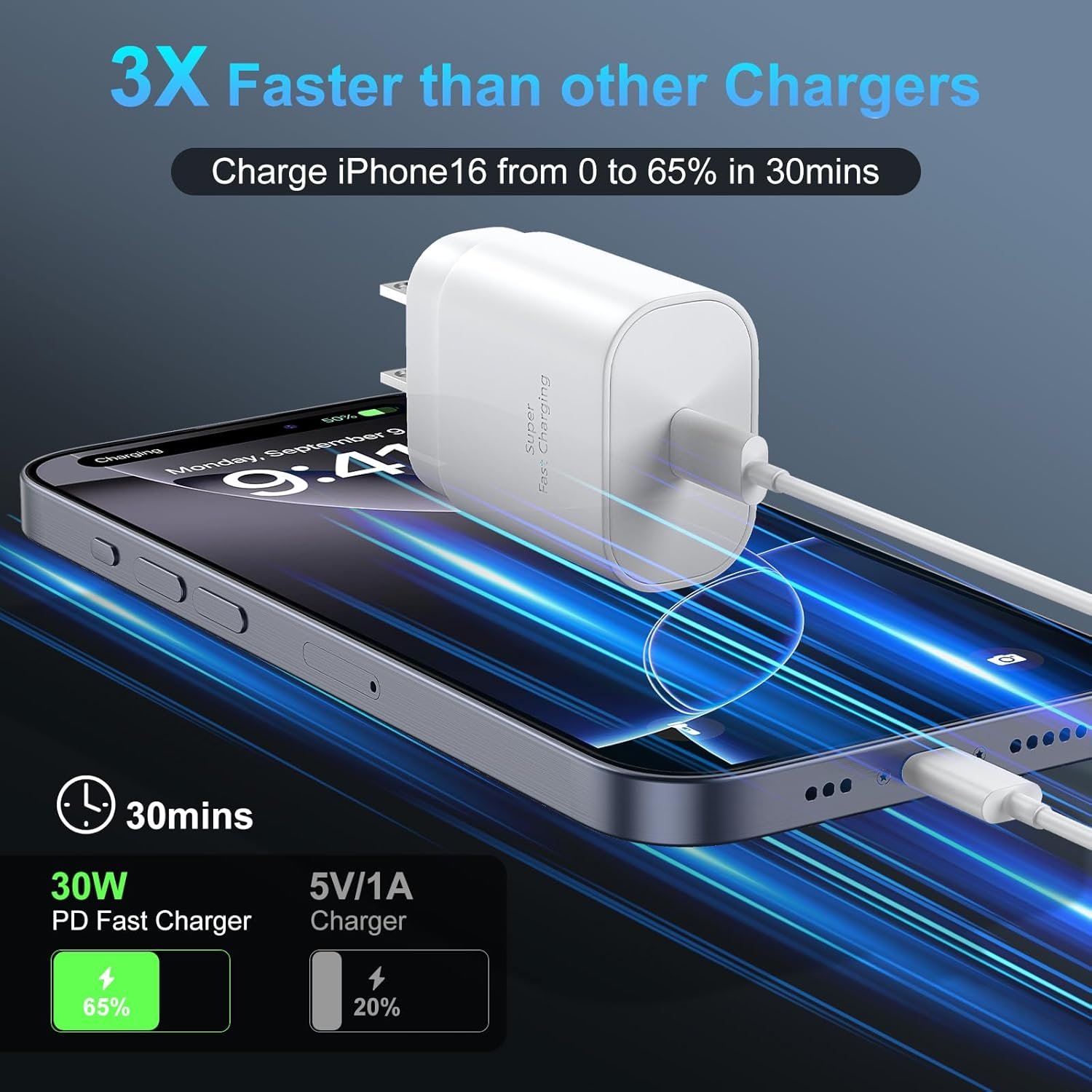 【4X Fast Charger iPhone 16 Pro Max】30W PD iPhone 16 USB C Charger with 65W/3A 10FT USB C to USB C Cable cord Provides Max 30W output power, PD adapter 3.0 Quickly Charge provides 4X faster than standard USB charger. charging up to 70% in just 30 minutes for your iPhone 16 Pro Max Charging, At 3A Maximum, Helps You Work Efficiently.
