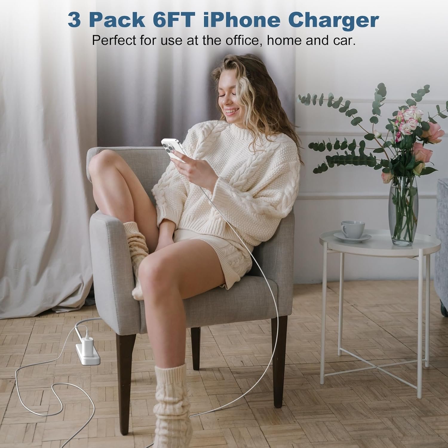 These iPhone charging cords are nice and long, so it really gives you a lot of options about where you’re using them. you can charge your iPhone or iPad in the car, at the office, and have a spare cable!Because of the 6 ft cord , you can plug in to wall and sit on the couch or chair and use your phone while it’s charging.