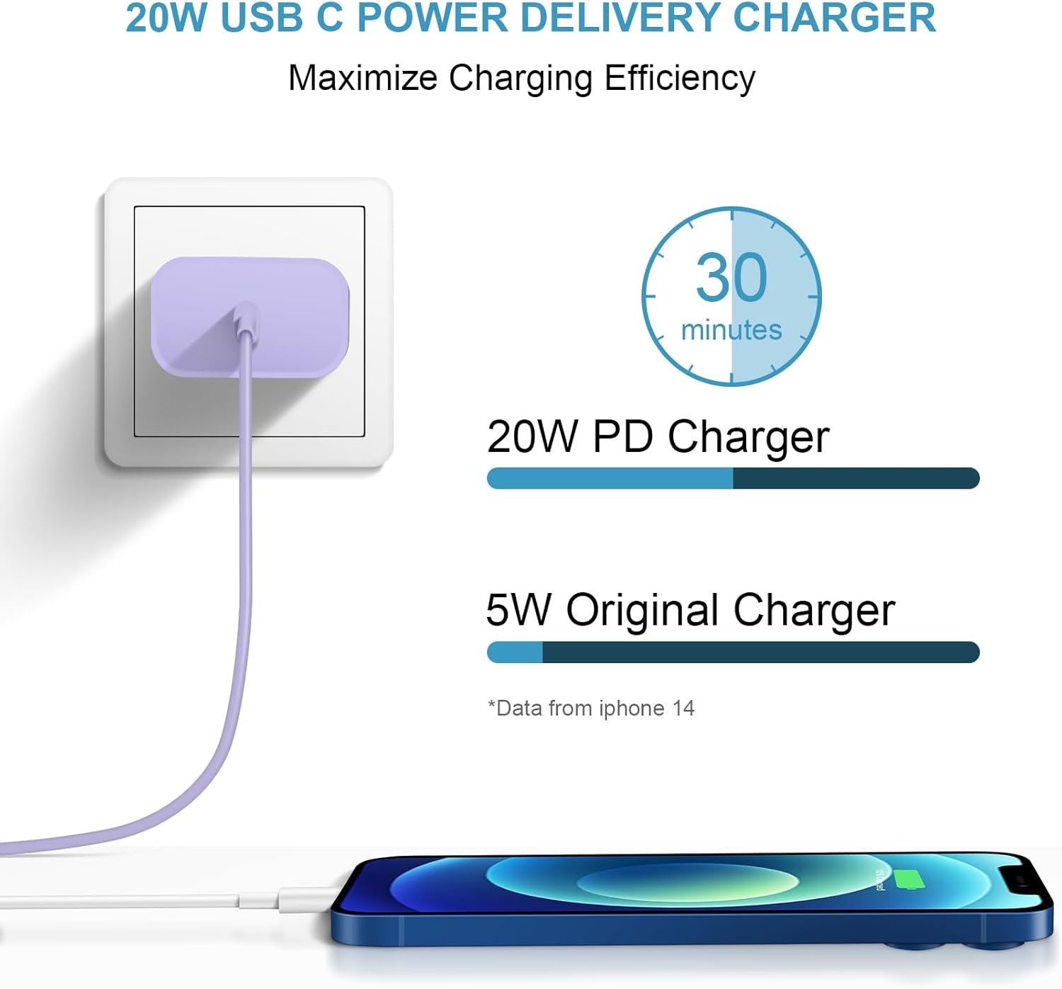 Compared with 5W original charger, this 20W PD fast charger for Phone could save more than 1 hour for you!