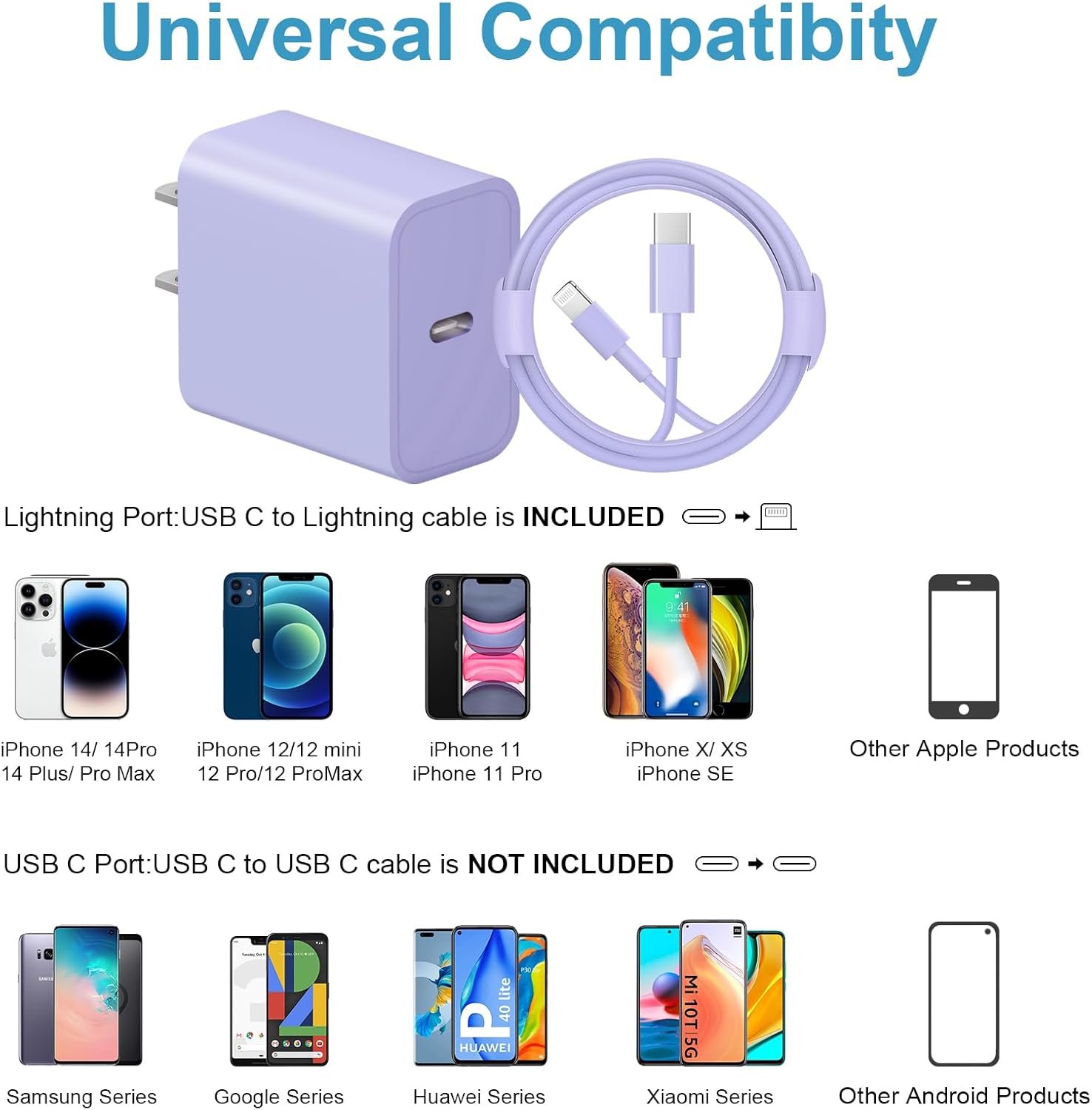 Package included: 1 x USB-C wall charger, 1 x 6 FT USB C to Lightning iPhone cable.