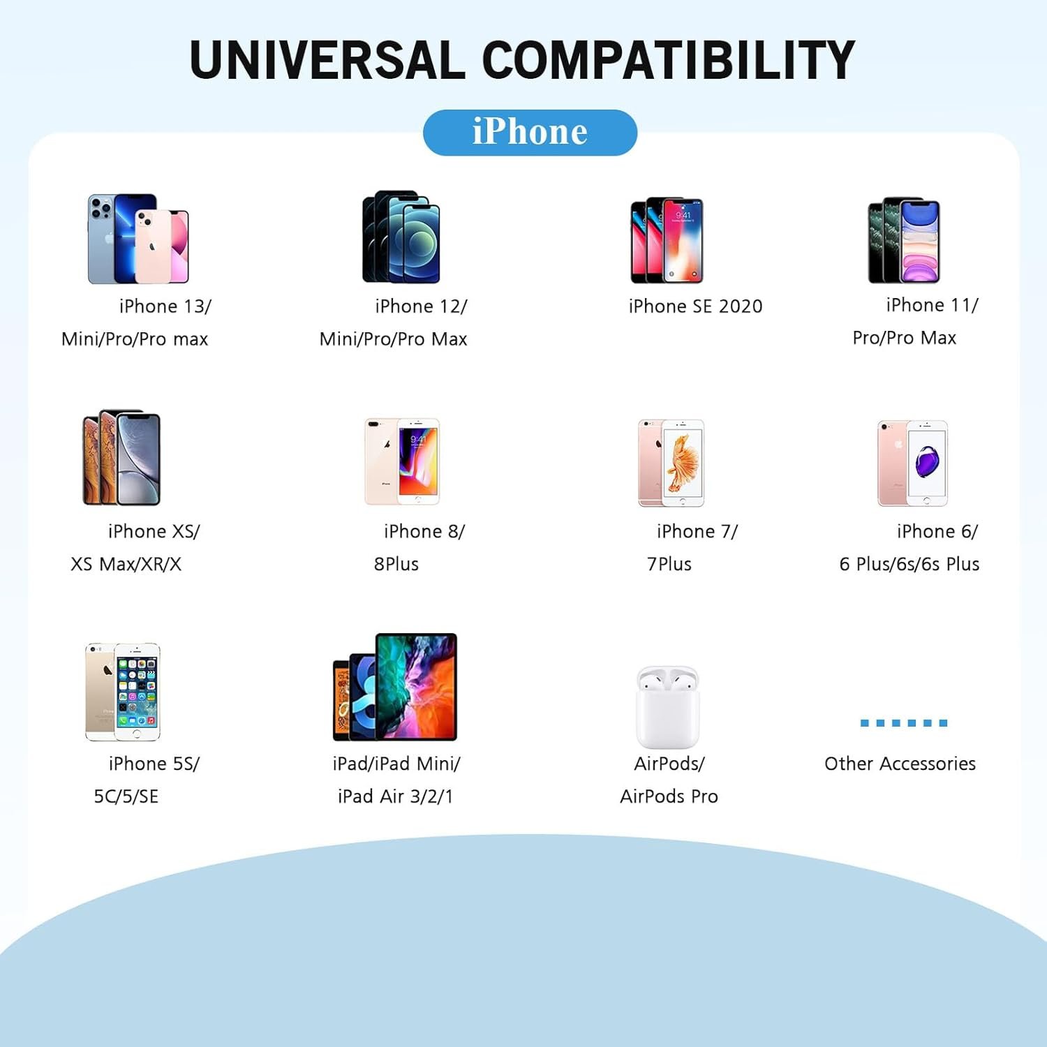 【iPhone Chargers Approved】The iPhone Fast Charger with Lightning Cable cord is compatible with all Charger devices including iPhone 13/iPhone 13 Mini/iPhone 13 Pro/iPhone 13 Pro Max/iPhone 12/ iPhone 12 Mini/iPhone 12 Pro/iPhone 12 Pro Max/iPhone SE 2020/iPhone 11/iPhone 11 Pro/iPhone 11 Pro Max/iPhone XS/XS Max/XR/X/iPhone 8/8Plus/iPhone 7/7Plus/iPhone 6/6 Plus, iPad and iPod.